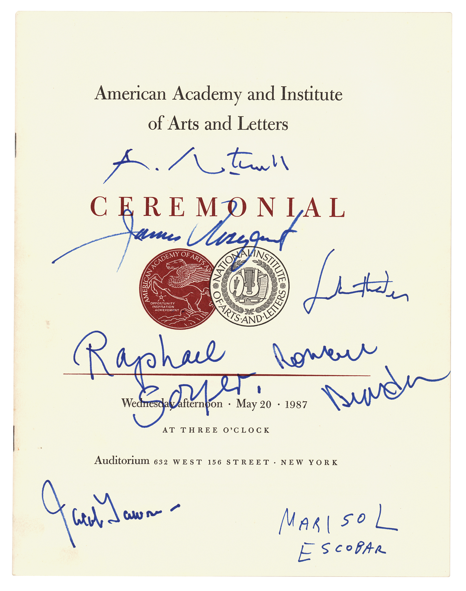 Ceremonial program for the American Academy and Institute of Arts and Letters festivities of May 20, 1987, 16 pages, 8.5 x 11, signed on the front cover in blue felt tip by Robert Motherwell, Helen Frankenthaler, James Rosenquist, Jacob Lawrence, Romare Bearden, Raphael Soyer, and Marisol Escobar. In fine condition.