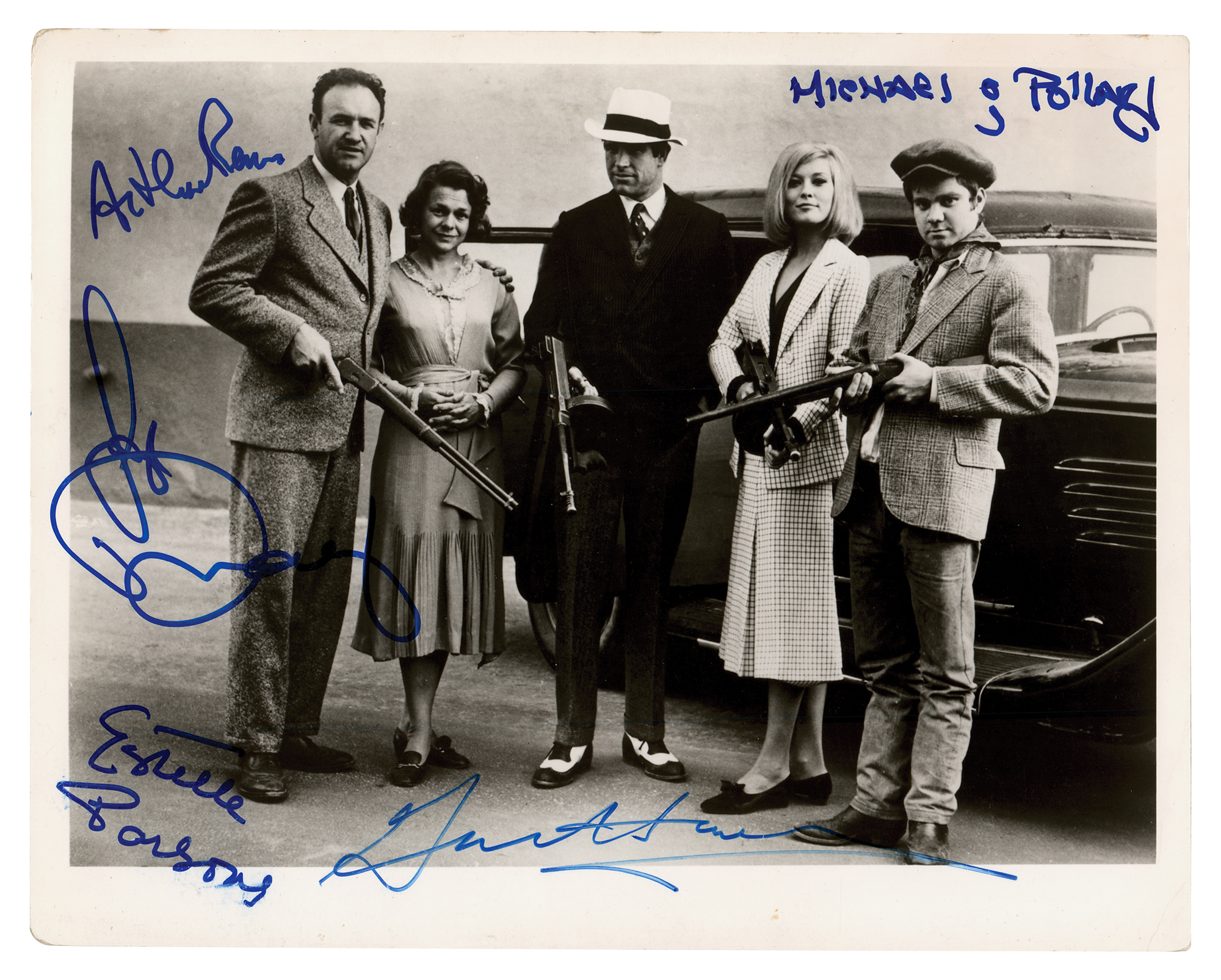 Glossy 10 x 8 photo of the cast of the 1967 film Bonnie and Clyde, signed in blue felt tip by Faye Dunaway, Estelle Parsons, Gene Hackman, Michael J. Pollard, and director Arthur Penn. In fine condition, with wear to corners.