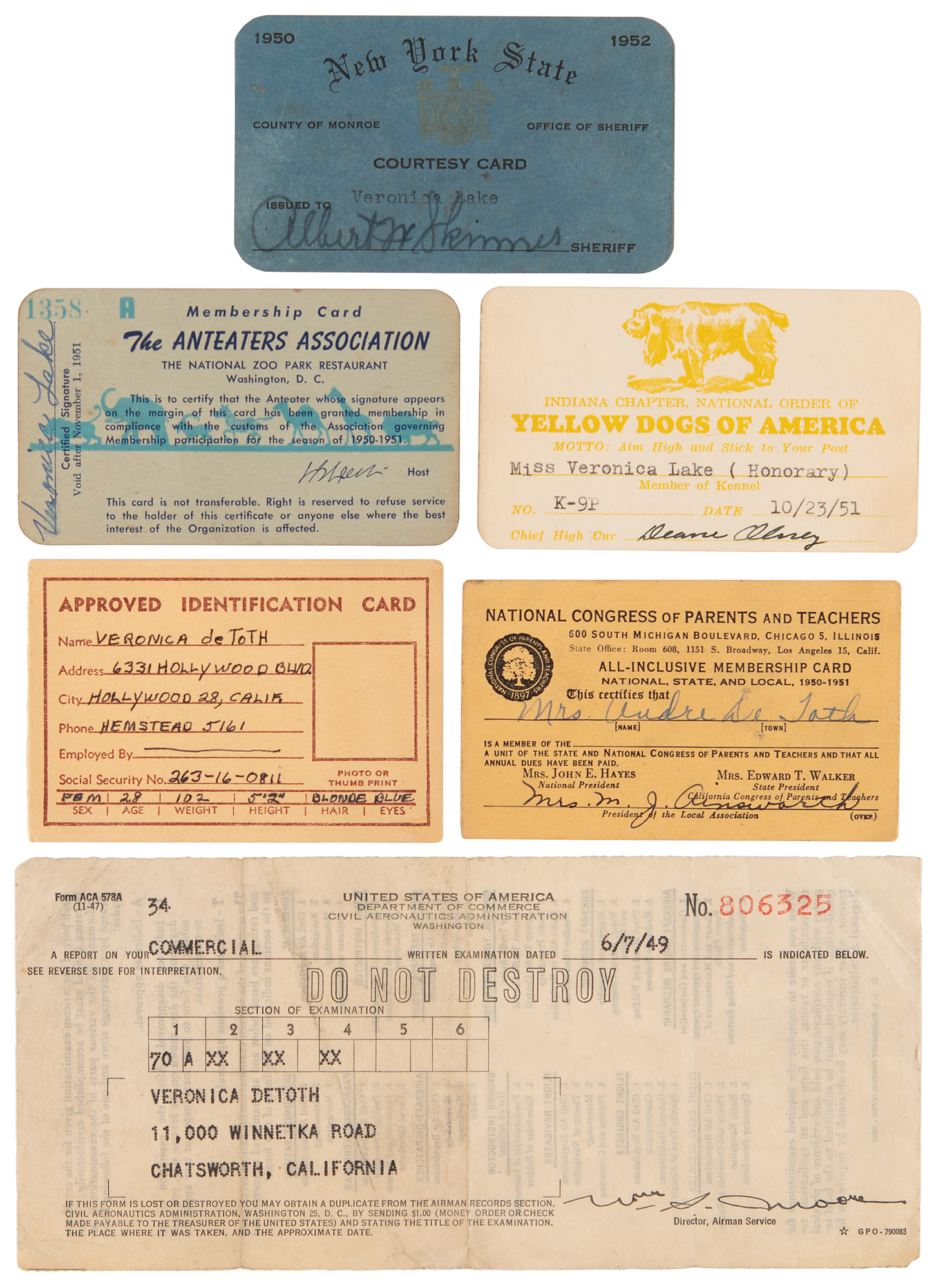 Group of six personal membership cards and documents belonging to Veronica Lake, circa 1940s–1950s, including two signed by the actress: an Anteaters Association membership card from the National Zoo Park Restaurant, signed in fountain pen with her professional name, "Veronica Lake"; a National Congress of Parents and Teachers All-Inclusive Membership Card, signed in fountain pen with her married name, "Mrs. Andre de Toth"; a Yellow Dogs of America, Indiana Chapter membership card issued to Veronica Lake; an "Approved Identification Card" issued to Veronica de Toth; a New York State Courtesy Card issued to Veronica Lake; and a Department of Commerce airman examination certificate issued to Veronica de Toth. In overall very good to fine condition.