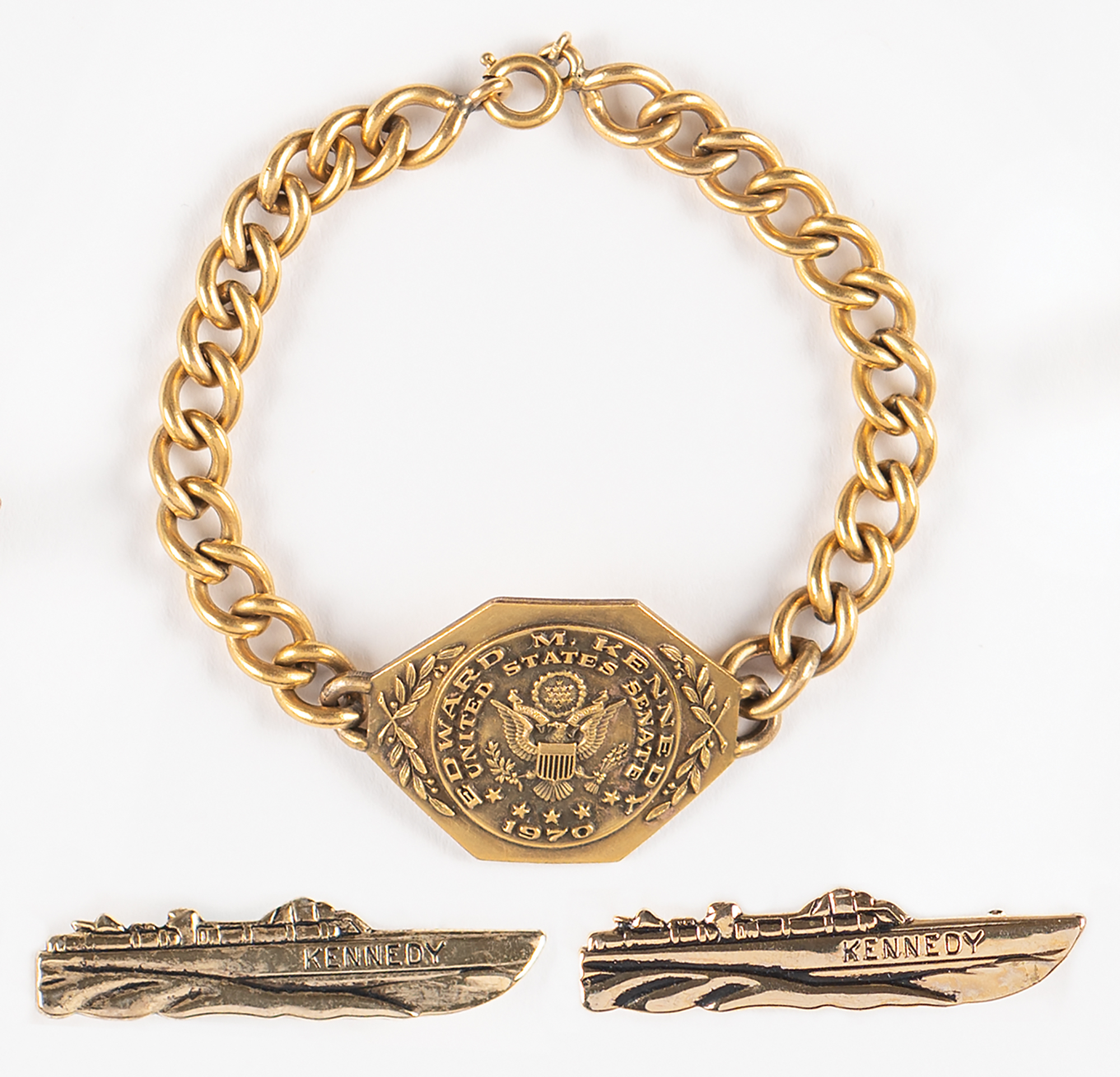 Three pieces of campaign jewelry: two gold-tone PT-109 campaign pins from the 1960 presidential race, engraved on the side "Kennedy" (a less common variant than the typical "Kennedy 60" examples); and a gold-filled charm bracelet featuring the seal of the United States Senate, encircled by "Edward M. Kennedy, 1970." In fine condition. Consignor notes that these originate from the collection of Helen Keyes, a longtime assistant to members of the Kennedy family.