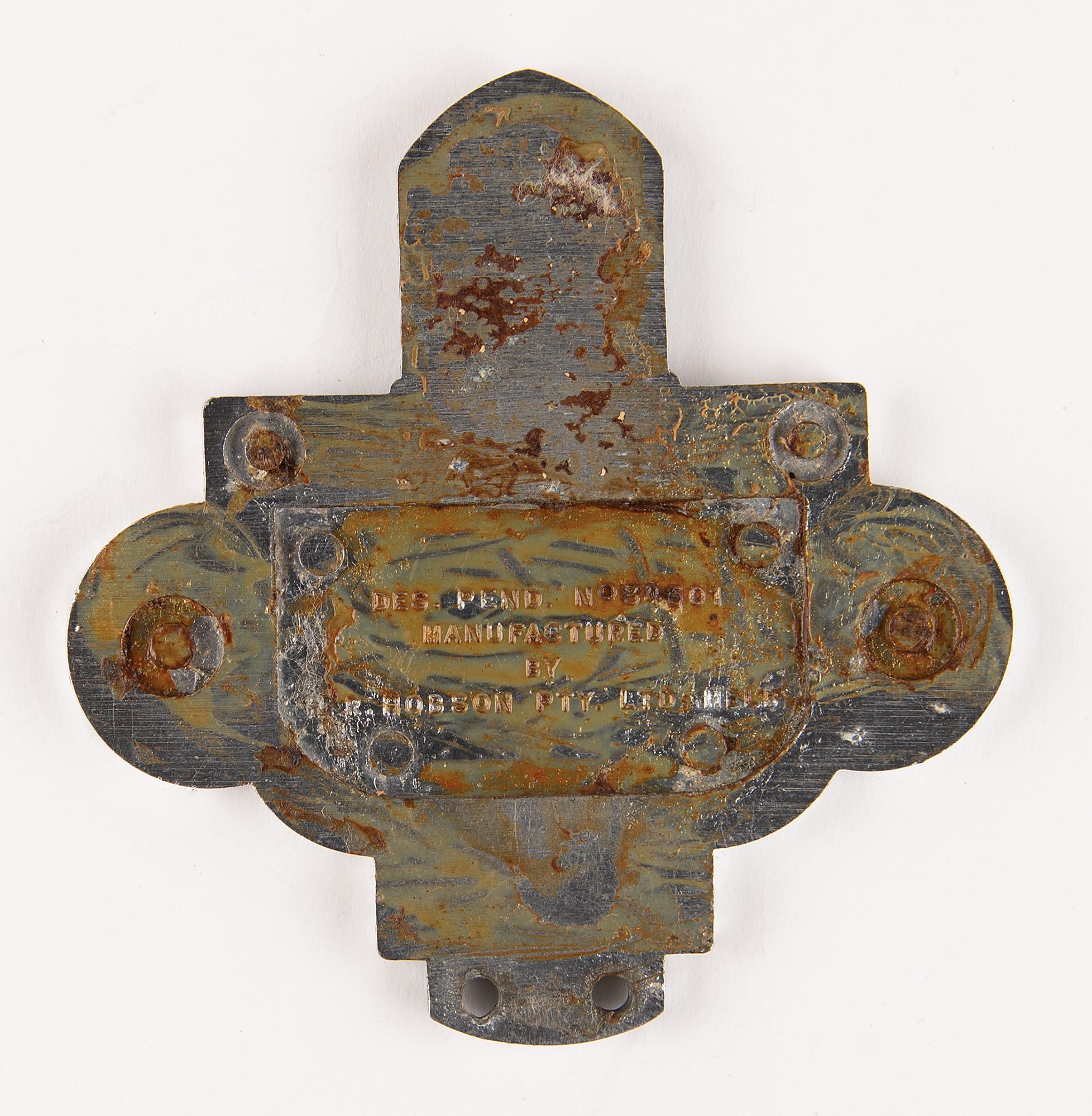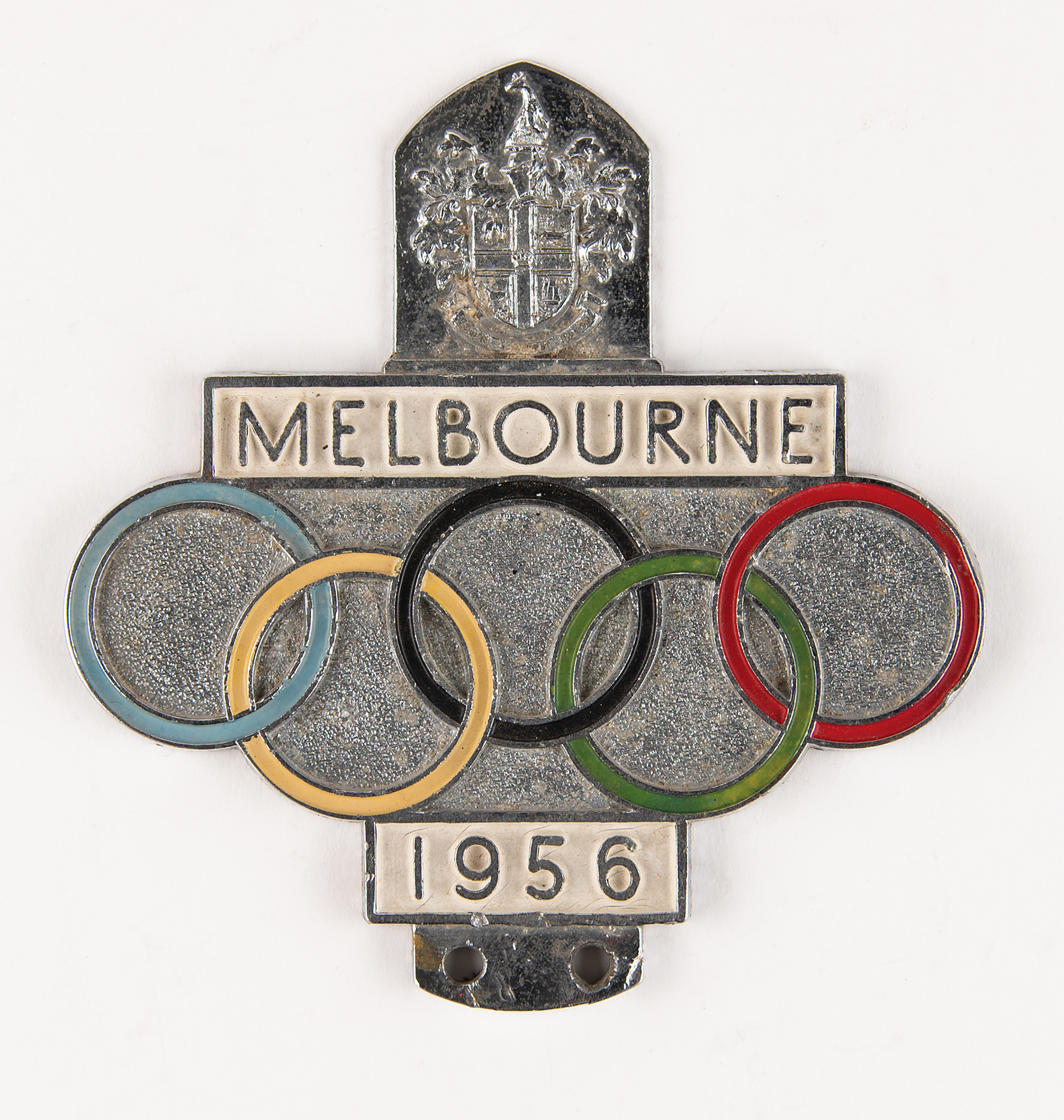 Attractive chrome automobile badge from the Melbourne 1956 Summer Olympics, measuring 100 mm x 105 mm, featuring enameled Olympic rings situated between two white panels that read "Melbourne / 1956," surmounted by the city's coat of arms. Reverse is marked: "Des. Pend. No 34501, Manufactured by H. R. Hobson Pty. Ltd. Melb."