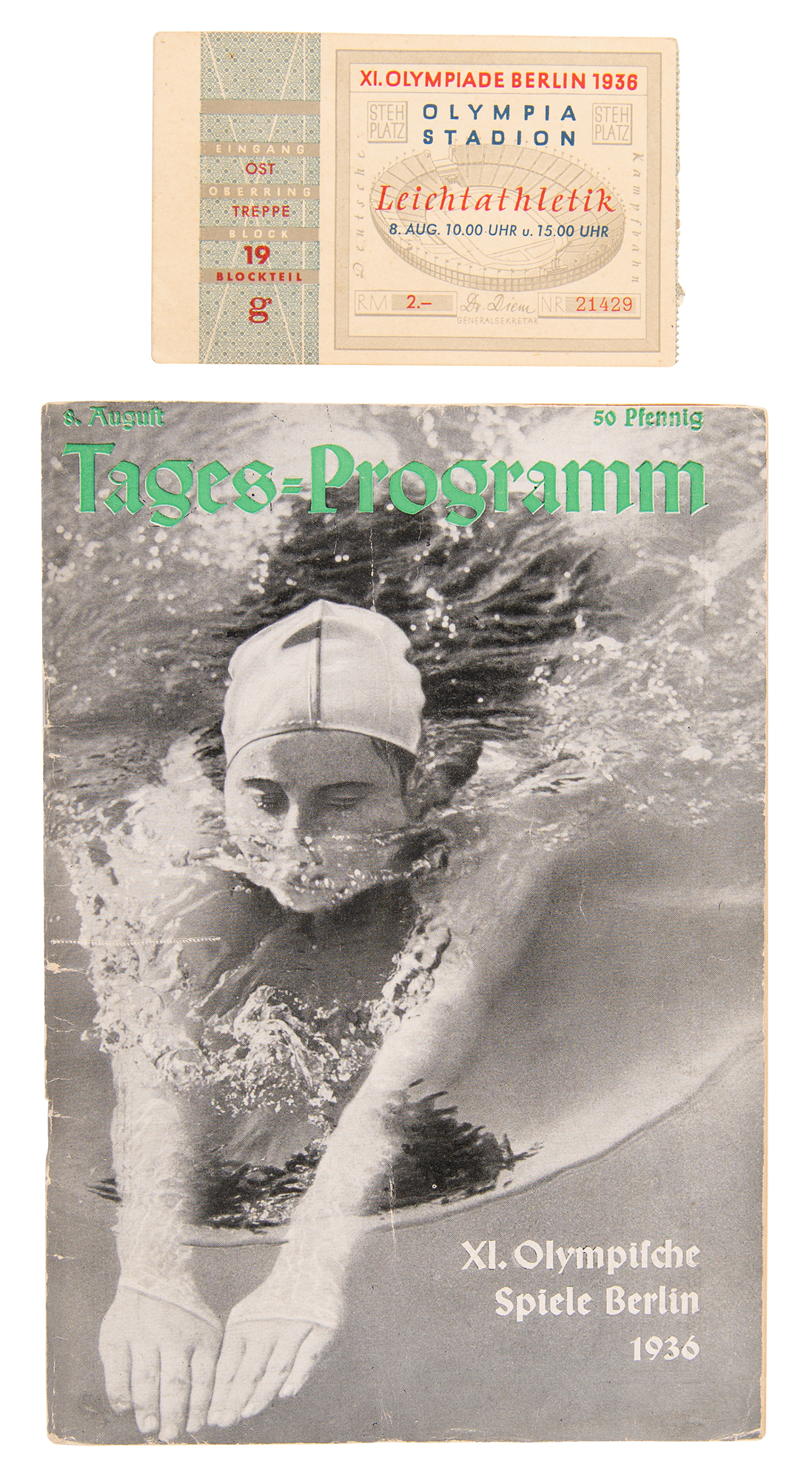Official daily program from the Berlin 1936 Summer Olympics, 72 pages, 6 x 8.75, issued for August 8th, with the front cover featuring an image of a female swimmer. This German-language program lists rules and limitations, athlete names and rosters, and timetables for events, like the decathlon, 4 x 100-meter relay (heats), water polo, 100-meter freestyle (heats), and award ceremonies for cycling, shooting, and canoeing. Several pages are annotated in pencil by a spectator. Included with the program is an original 4.5 x 2.75 ticket stub for the ‘Athletics’ events at the Summer Olympics held in Berlin, Germany, on August 8, 1936, a date highlighted by the USA medal sweep in the decathlon. In overall very good to fine condition, with scuffs and marks to program cover.