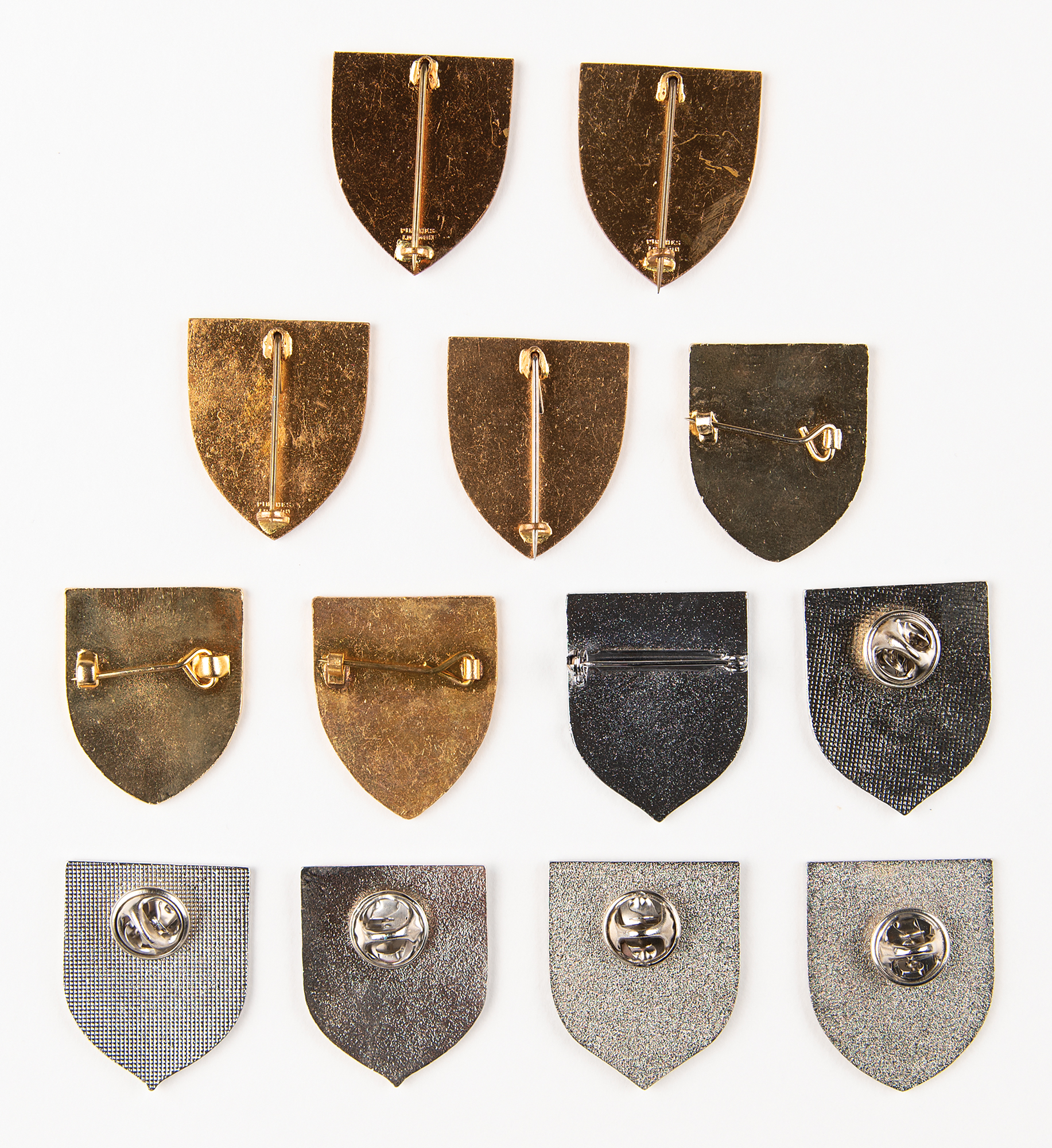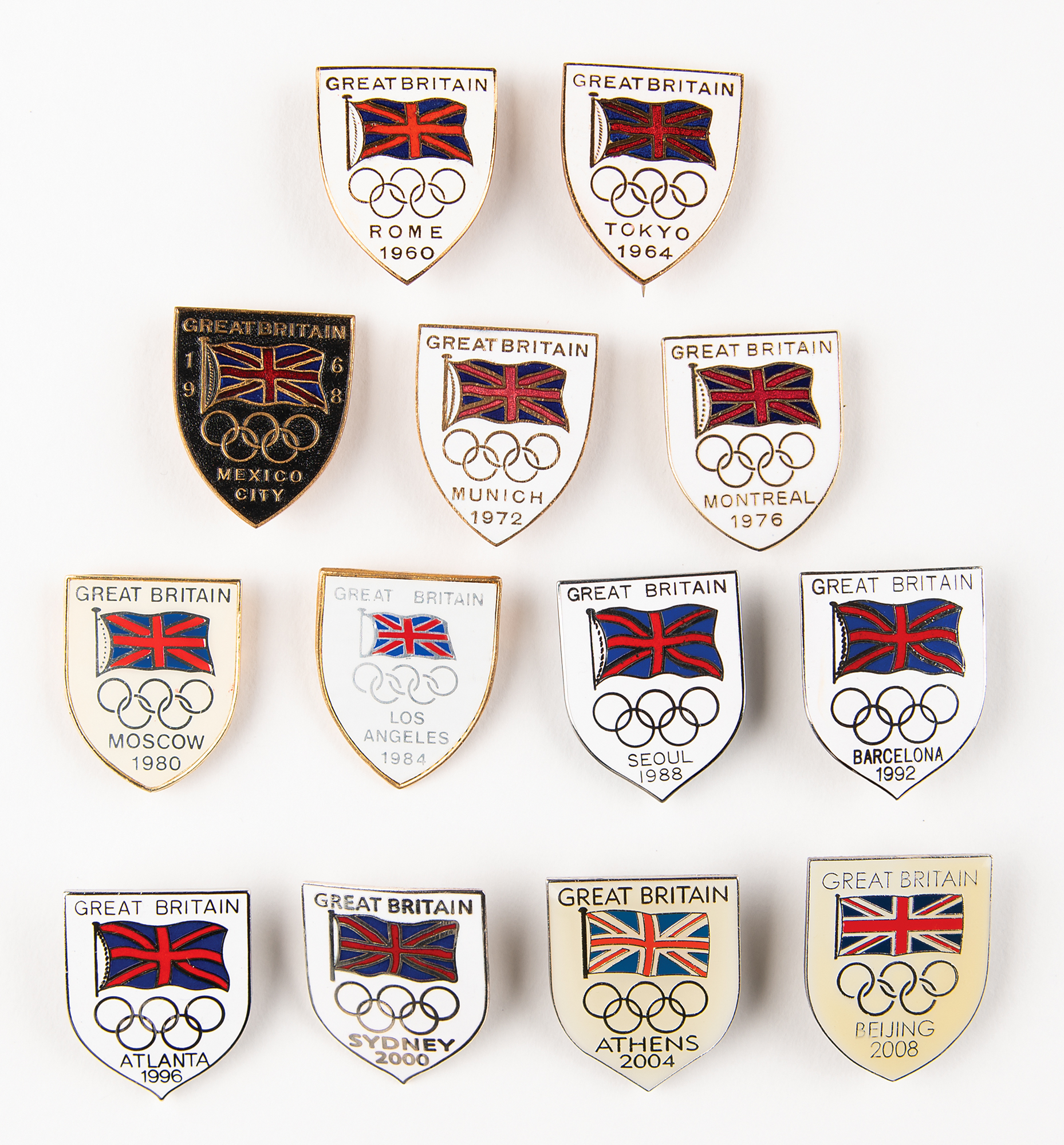 Appealing collection of 24 Olympic pins and badges issued to members of the Great Britain national team, including 13 shield badges, each approximately 25 mm x 38 mm, all featuring the Union Jack flag in colored enamel between “Great Britain” and the Olympic rings, with each badge identifying their Summer Games: Rome 1960, Tokyo 1964, Mexico City 1968, Munich 1972, Montreal 1976, Moscow 1980, Los Angeles 1984, Seoul 1988, Barcelona 1992, Atlanta 1996, Sydney 2000, Athens 2004, and Beijing 2008. Other pins and badges include: two gold-tone badges issued to the Great Britain women’s team at Tokyo 1968 and Montreal 1976; two London 2012 candidate pins; three “Team England,” “Team GM,” and “Gt. Britain” pins; an equestrian pin (missing spike); a hockey pin; a “USA / The British Olympic Association” pin; and a shield badge commemorating the 1956 “Visit of the British Olympic Team” to Hammersmith. In overall fine condition.