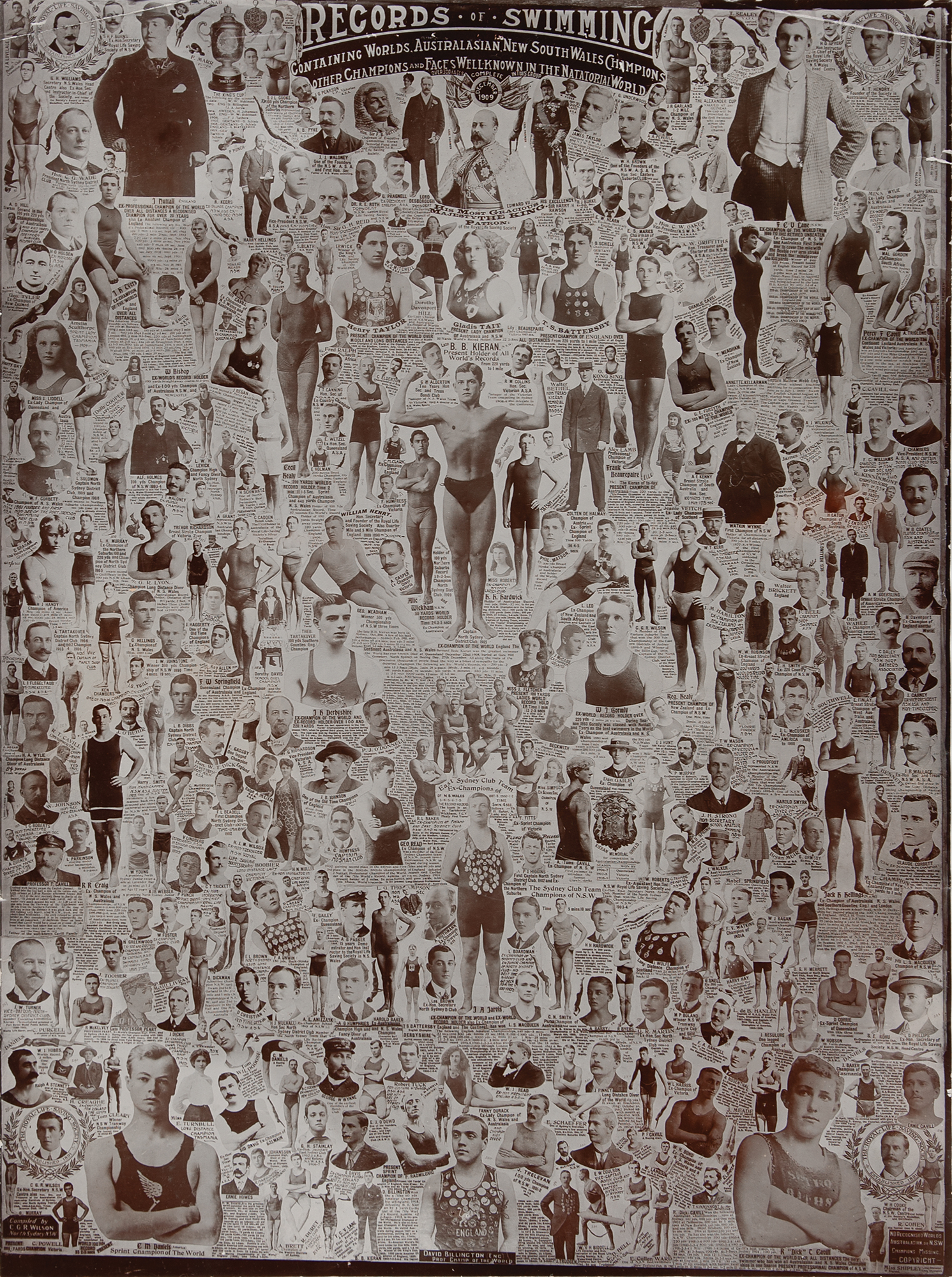 Exceptionally rare vintage pearl-finish 10.75 x 14.5 light-weight photo of over 300 of the most accomplished swimmers of the early 20th century. The photo, which is headed “Records of Swimming, Containing Worlds, Australasian, New South Wales Champions, Other Champions and Faces Well-Known in the Natatorial World, Over 300 Faces in This Group, Complete, December 1909,” boasts an impressive composite of many early swimming pioneers, with the center featuring a large full-length pose of Australian swimmer Bernard Kieran, who tragically died at the age of 19 following an operation to remove his appendix. His caption reads: “Late B. B. Kieran, Present Holder of All World’s Records, From 220 Yards to Mile.” In very good to fine condition, with scattered surface impressions, a horizontal fold to lower portion, edgewear, and creases to upper corners.
