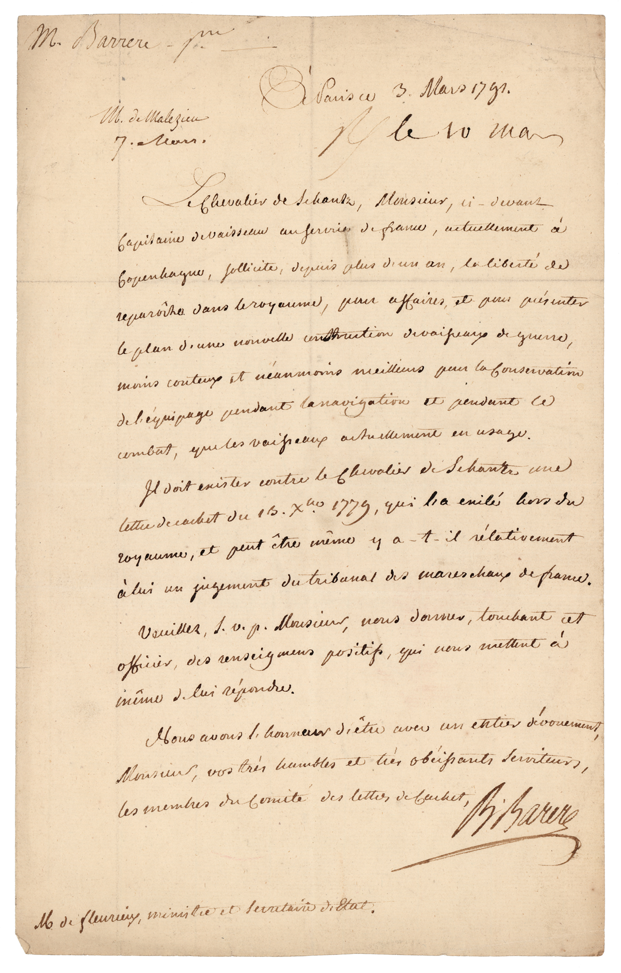 One of the most notorious members of the National Convention during the French Revolution, he presided over the trial of Louis XVI and voted for his execution (1755-1841). LS in French, signed “B. Barere,” one page, 7.75 x 12.25, March 3, 1791. Untranslated letter to M. de Fleurieux, "ministre et secretaire d'Etate," requesting reassignment for Chevalier de Sehantes. In fine condition.