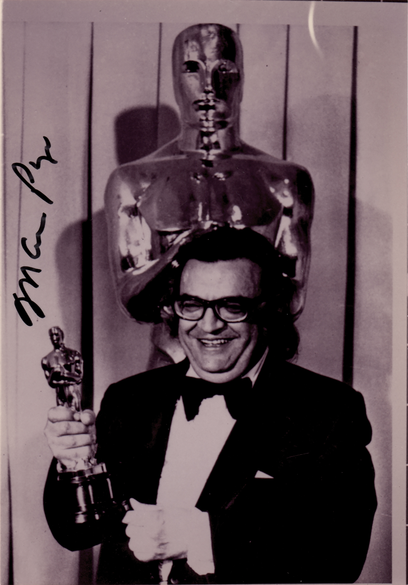 Glossy 3.5 x 5 photo of Mario Puzo holding his Oscar for best screenplay for The Godfather Part II, signed in black felt tip. In fine condition, with a Beckett authentication label affixed to the reverse.