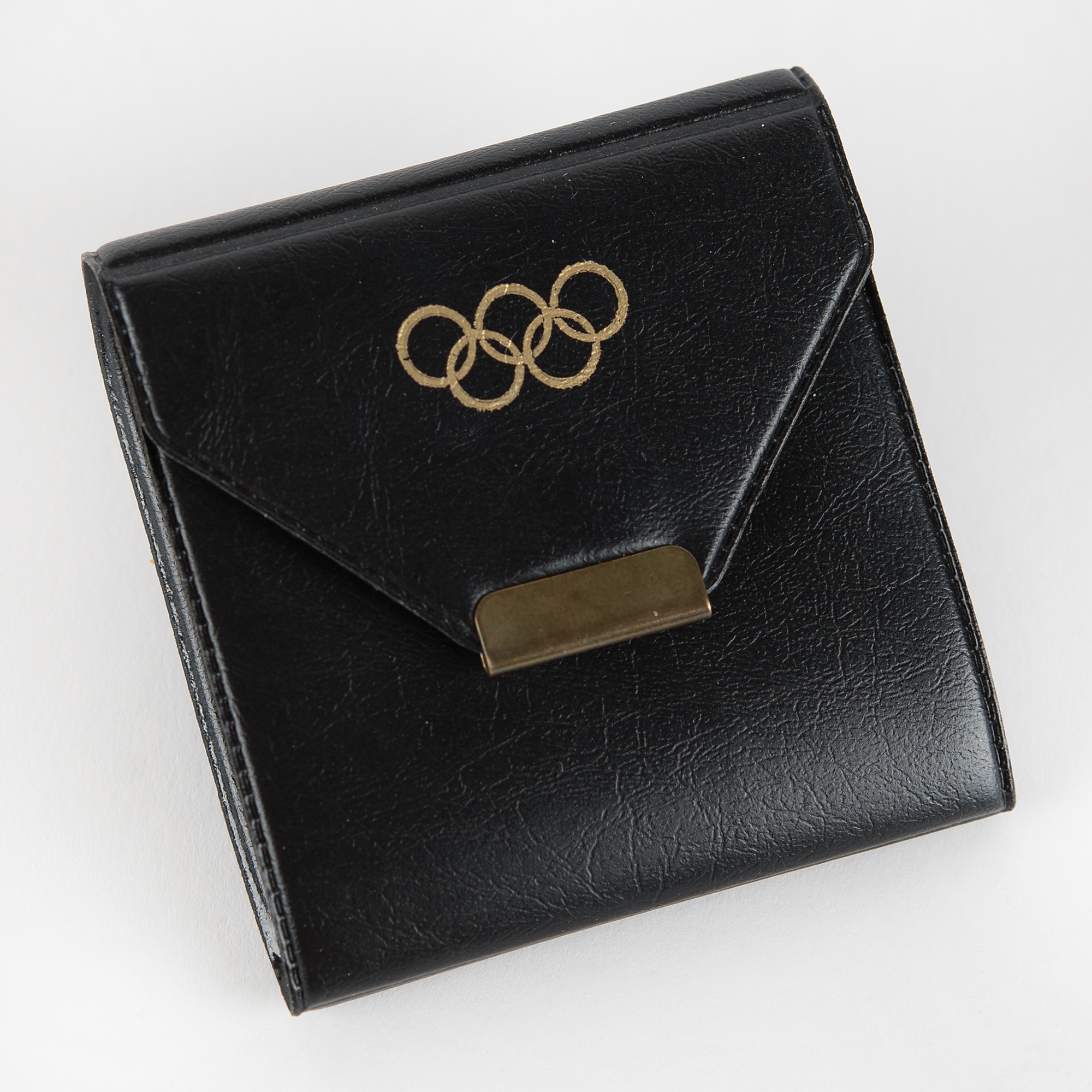 Scarce first-place winner’s pin from the Tokyo 1964 Summer Olympics. Made by Bertoni of Milan and issued retroactively to a gold medal-winning participant of the XVIII Olympiad in the 1980s. The pin features the Olympic rings above a banner with the contest year. Complete with its original paper backing marked as “6934” and its black vinyl presentation pouch made by Bertoni.