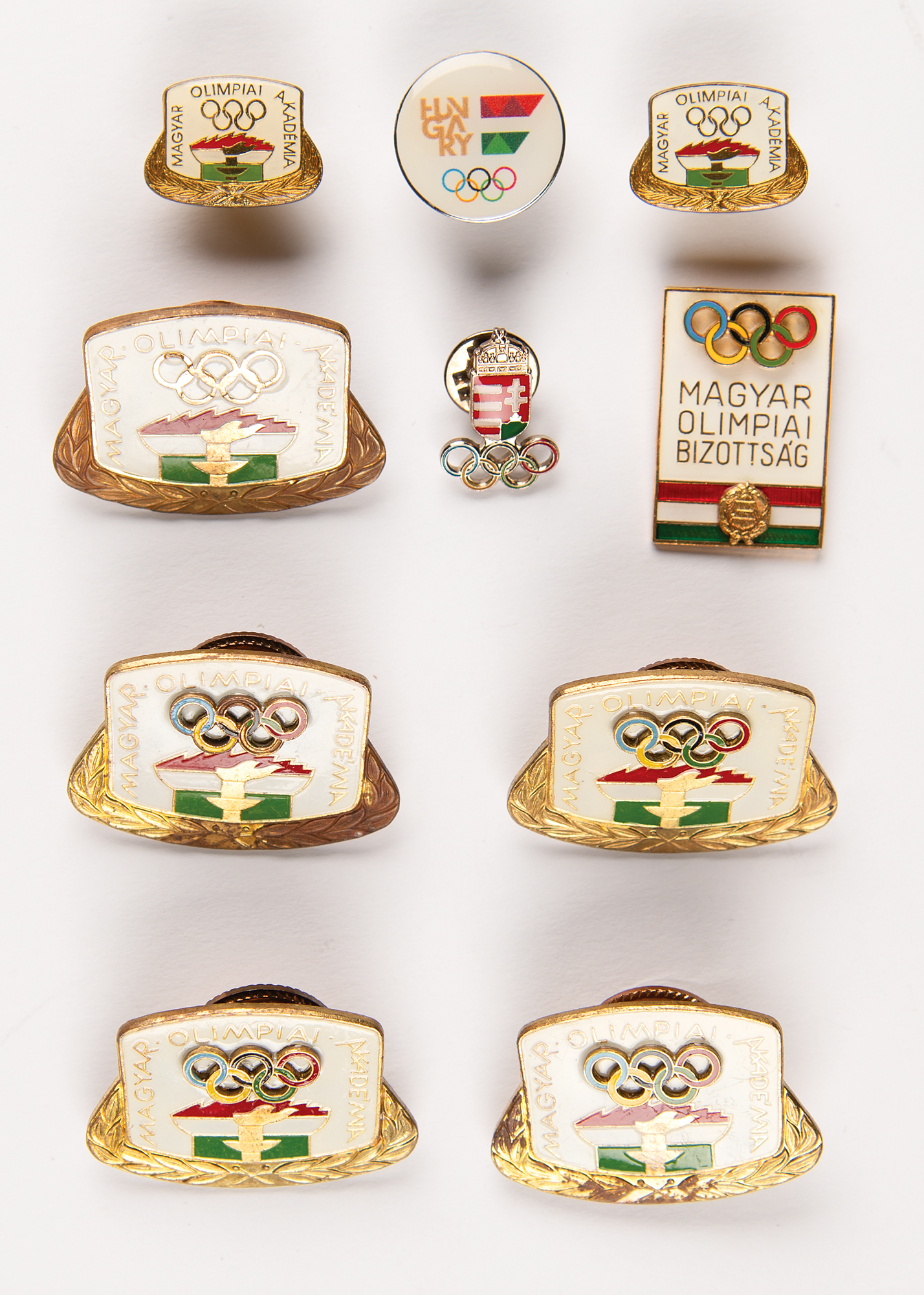 Collection of 29 Hungarian National Olympic Committee (NOC) pins from various Summer and Winter Olympics, ranging in size from 13 mm x 19 mm to 32 mm x 70 mm, the majority of which feature the Olympic rings, enamel designs, and the colors of the Hungarian flag. Pins for Summer Games include Rome 1960, Tokyo 1964 (4), Munich 1972, Montreal 1976 (3), Sydney 2000, and Beijing 2008 (3). Pins for the Winter Games include Grenoble 1968 (2), Calgary 1988, Nagano 1998, and PyeongChang 2018. Also included is a pin for the Nanjing 2014 Summer Youth Olympics and 10 pins for the Hungarian NOC. In overall fine condition, with one Grenoble pin missing its shield.