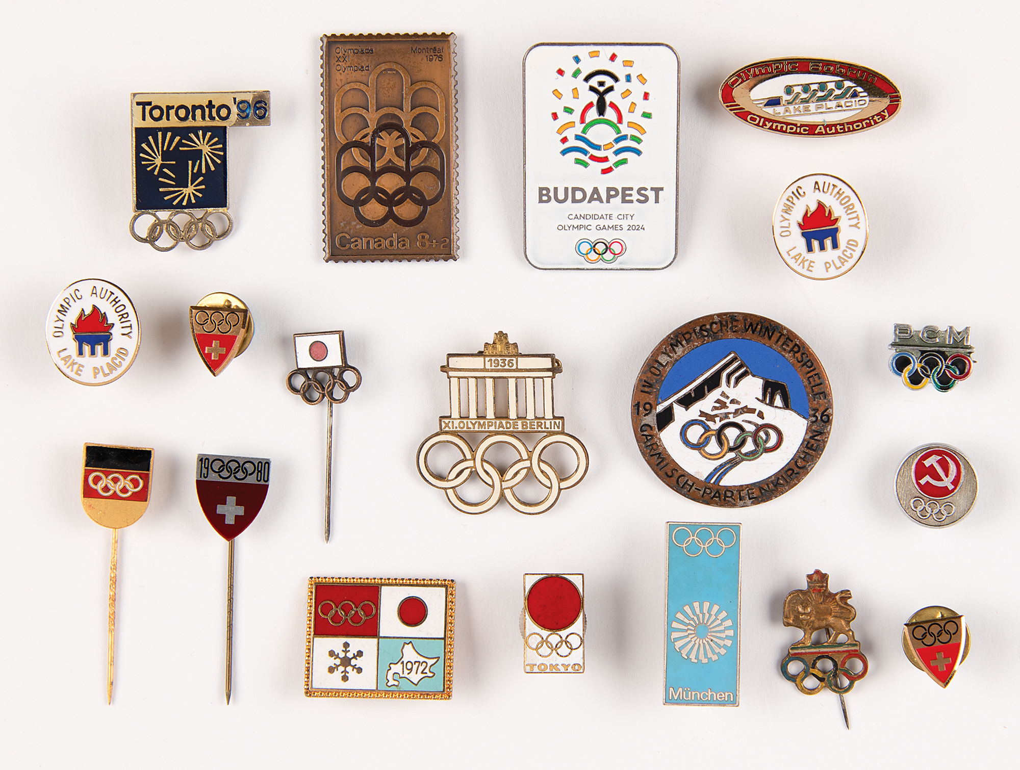 Collection of 18 pins and stickpins from past Summer and Winter Olympics, ranging in size from 13 mm x 13 mm to 25 mm x 38 mm, the majority of which feature the Olympic rings, enamel designs, and emblems for the respective Olympic Games or bid cities. Includes pins for the Berlin 1936, Tokyo 1964, and Munich 1972 Summer Games, the Garmisch 1936 and Sapporo 1972 Winter Games, Summer Olympics bid pins for Toronto 1996 and Budapest 2024, and various other pins related to Iran, Japan, Moscow, and Lake Placid. In overall fine condition. Includes a bronze Canadian Post stamp plaque, 25 mm x 38 mm, from the Montreal 1976 Summer Olympics.
