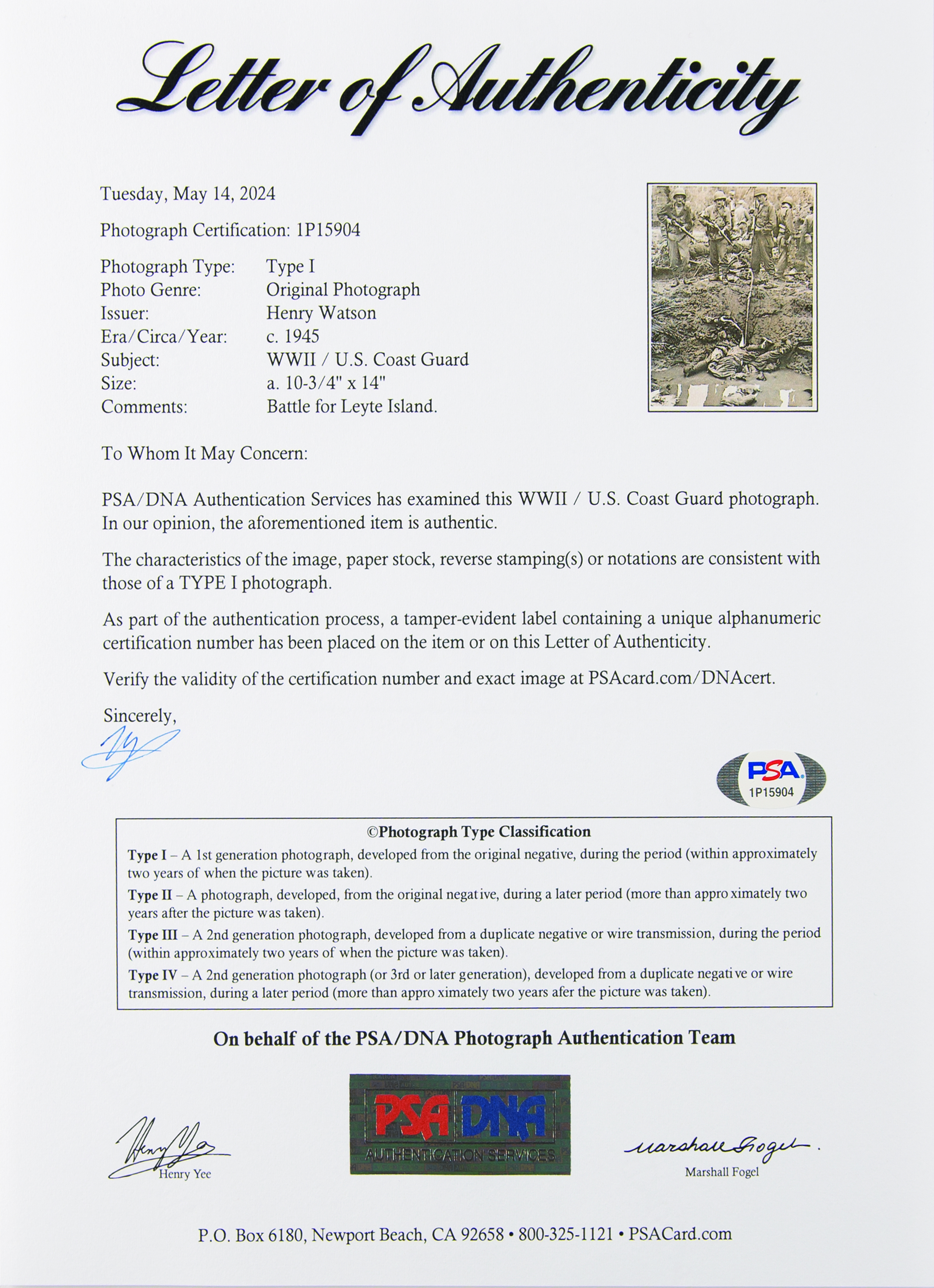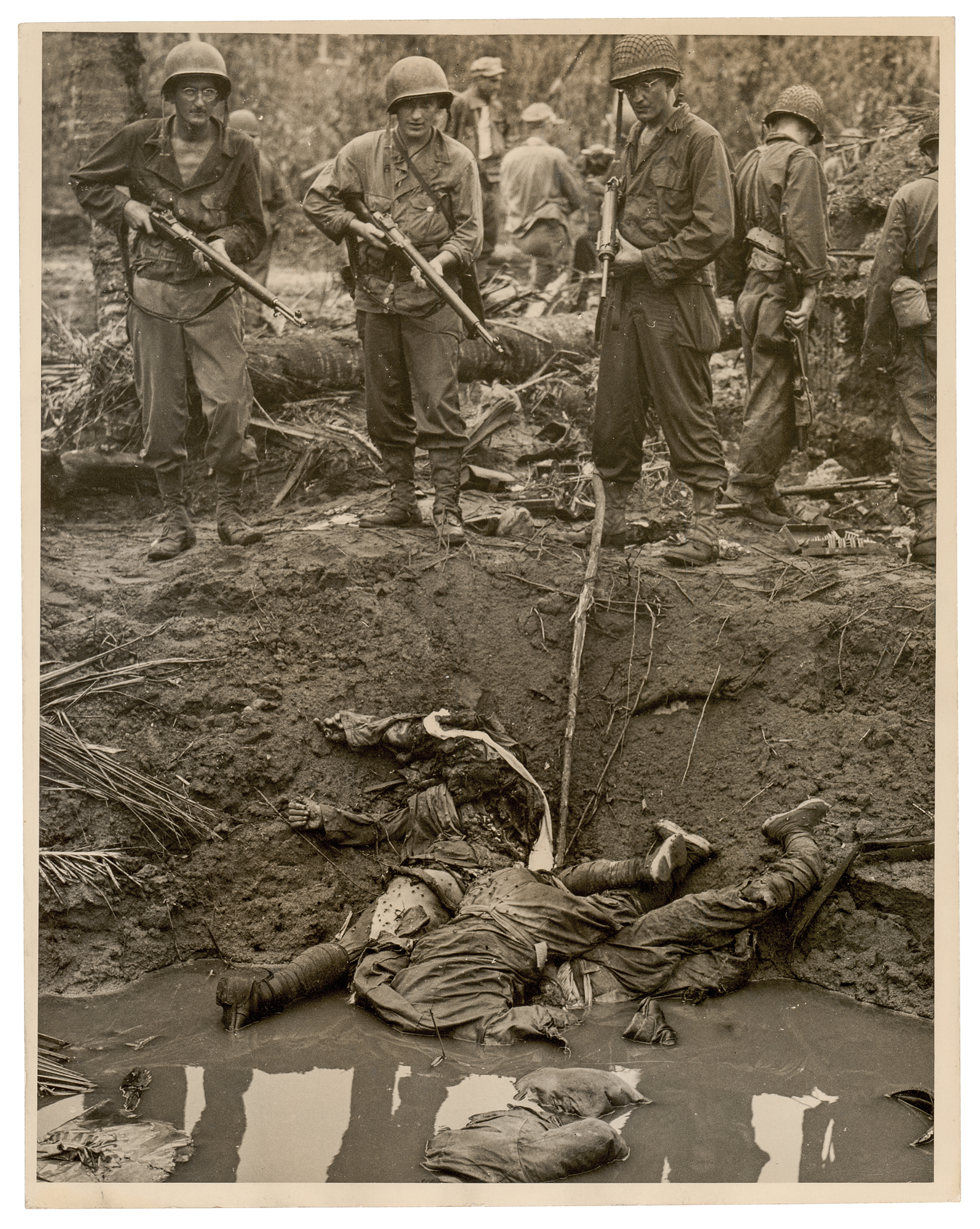 Original circa 1945 matte-finish 11 x 14 photograph of three American soldiers standing over a flooded bomb crater with the gory remains of Japanese snipers. The photograph, originally taken by Harry R. Watson of the United States Coast Guard, was captured during the Battle of Leyte in the Philippines. In fine condition, with a couple of faint creases. Accompanied by a full letter of authenticity from PSA/DNA, which identifies this as a ‘Type I’ photograph.