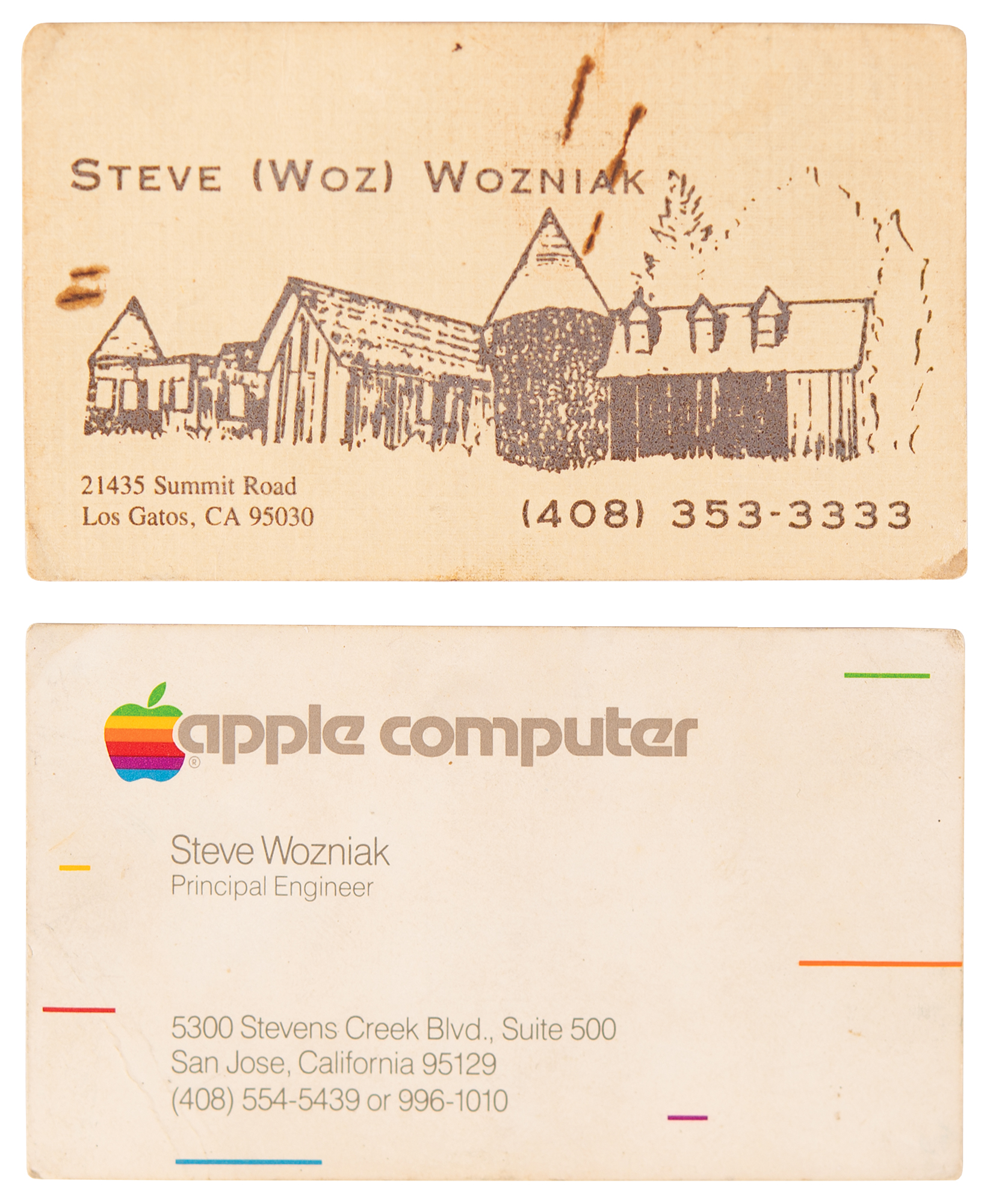Wozniak’s personal calling card from the mid-to-late 1980s, 3.5 x 2, with printed name, “Steve (Woz) Wozniak,” address, “21435 Summit Road, Los Gatos, CA 95030,” and telephone number, “(408) 353-3333,” with an engraved image of Wozniak’s former Redwood Ridge estate nestled at the summit of the Santa Cruz Mountains. In overall fine condition, with expected wear and soiling from use.