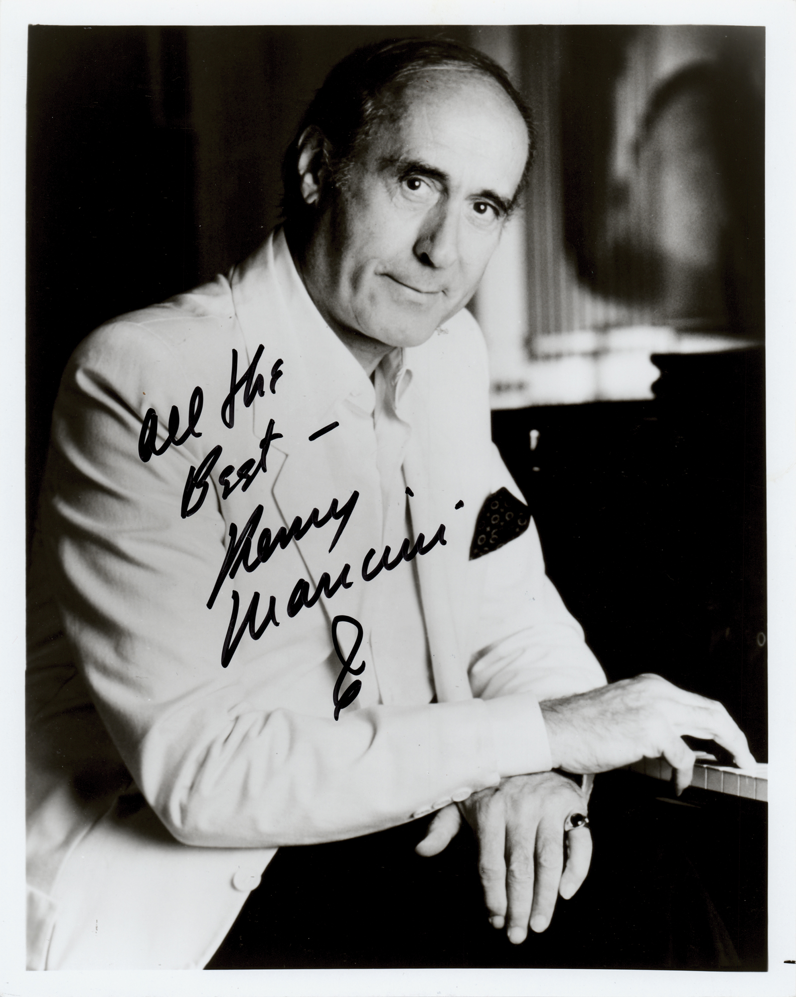 Glossy 8 x 10 photo of the popular film composer at his piano, signed in black felt tip, "All the Best—Henry Mancini." In fine condition.