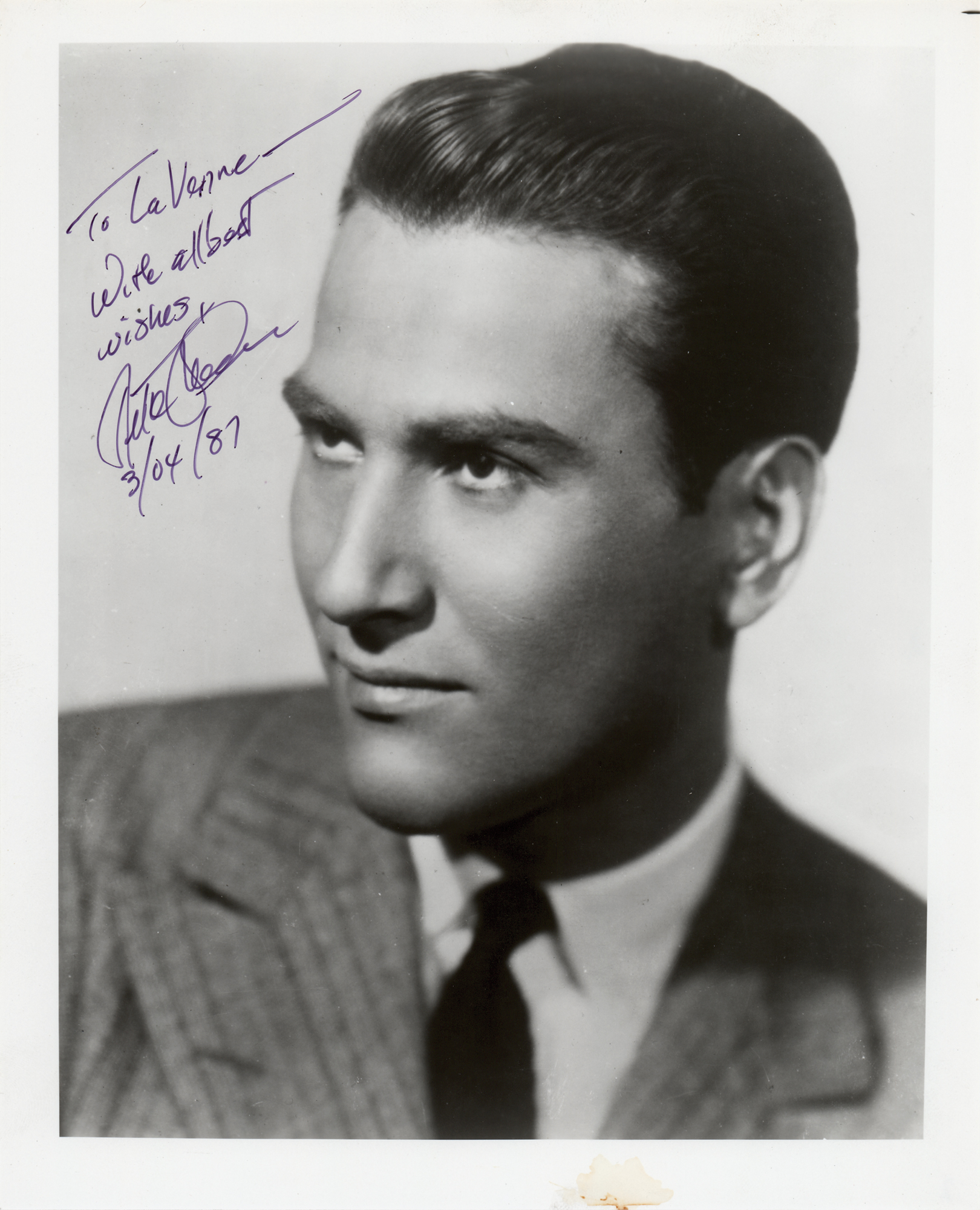 Glossy 8 x 9.75 head-and-shoulders photo of the clarinetist and bandleader, signed and inscribed in black felt tip, "To LaVerne—With all best wishes, Artie Shaw, 3/04/87." In fine condition, with a small stain in the lower border.