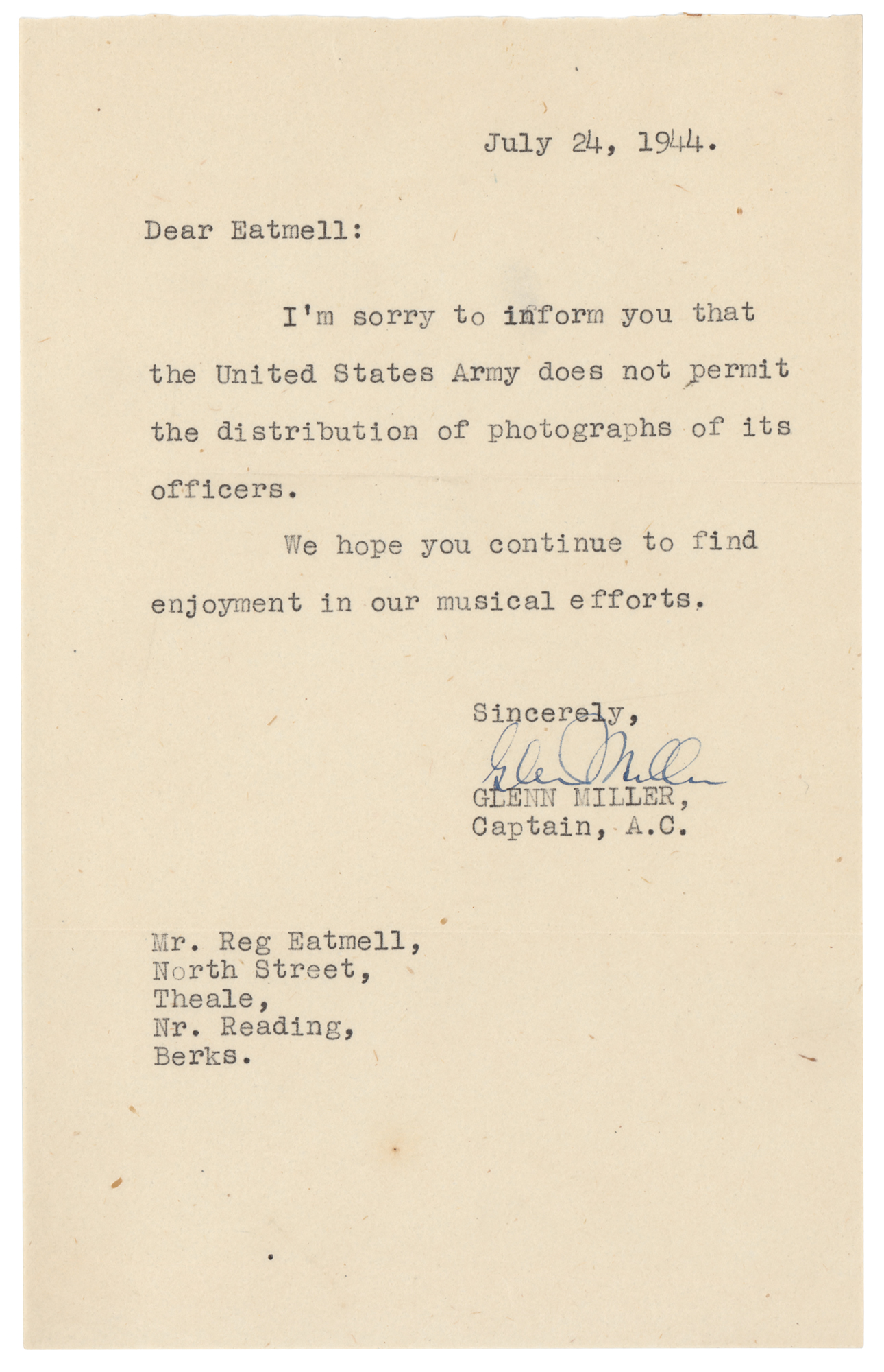 Popular big band trombonist and bandleader (1904-1944) who was lost in action over the English Channel during World War II. World War II-dated TLS, one page, 5 x 7.75, July 24, 1944. Letter to Reg Eatmell, in full: "I'm sorry to inform you that the United States Army does not permit the distribution of photographs of its officers. We hope you continue to find enjoyment in our musical efforts." In fine condition.