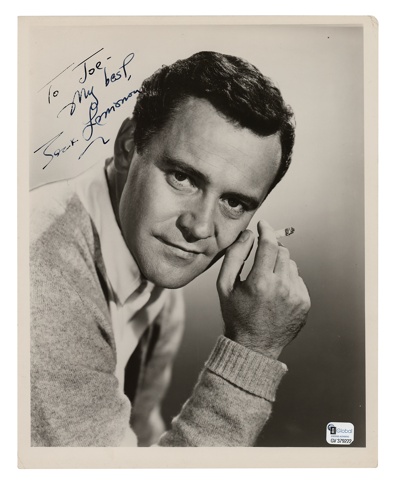 Vintage glossy 8 x 10 photo of Lemmon with a cigarette in hand, signed and inscribed in fountain pen, "To Joe, My best, Jack Lemmon.” In fine condition.