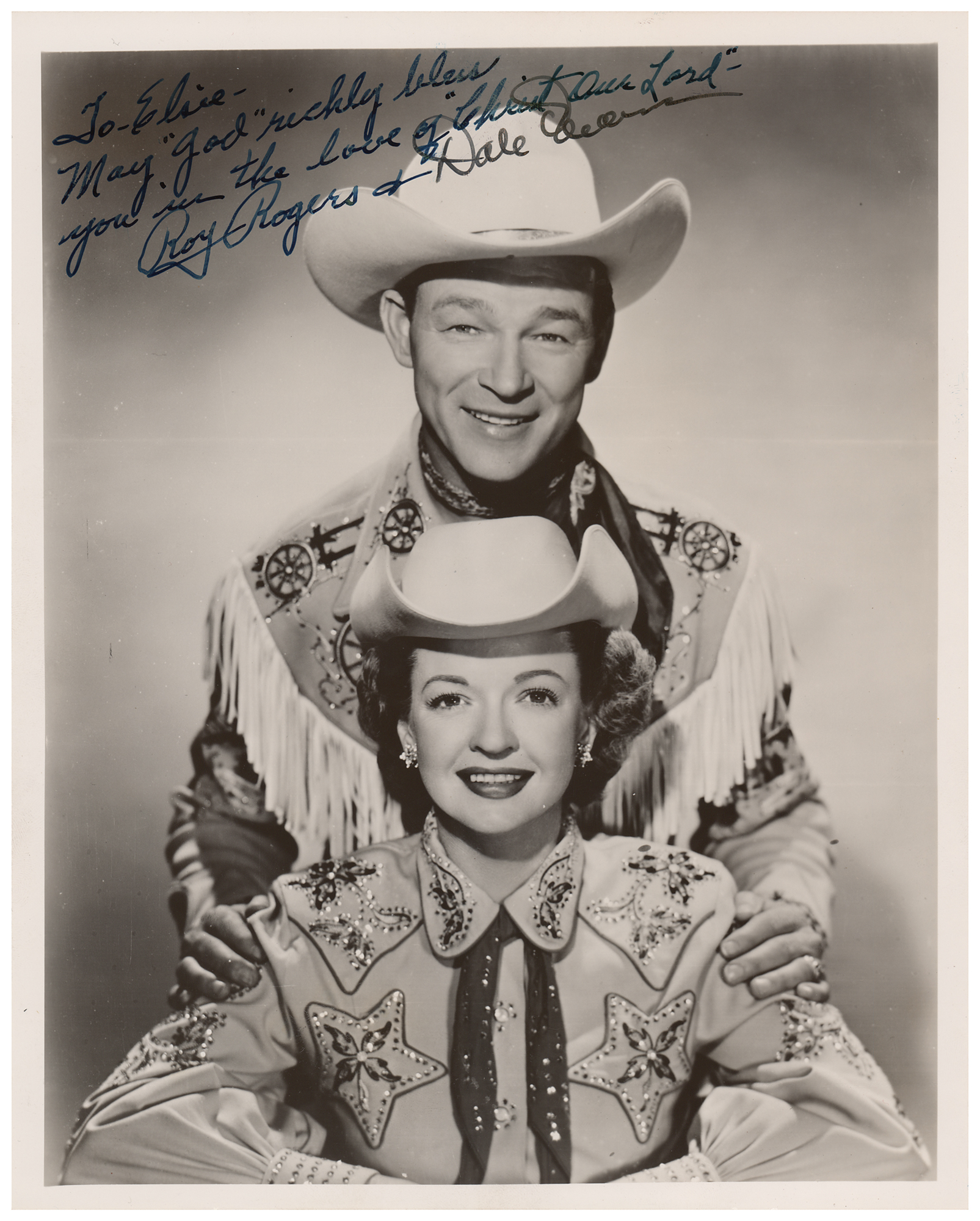 Vintage glossy 8 x 10 photo of the famous husband-and-wife Western duo, signed and inscribed in ink, "To Elsie—May 'God' richly bless you in the love of 'Christ Our Lord'— Roy Rogers &" and "Dale Evans." In fine condition. Surprisingly uncommon in photos authentically signed by both.