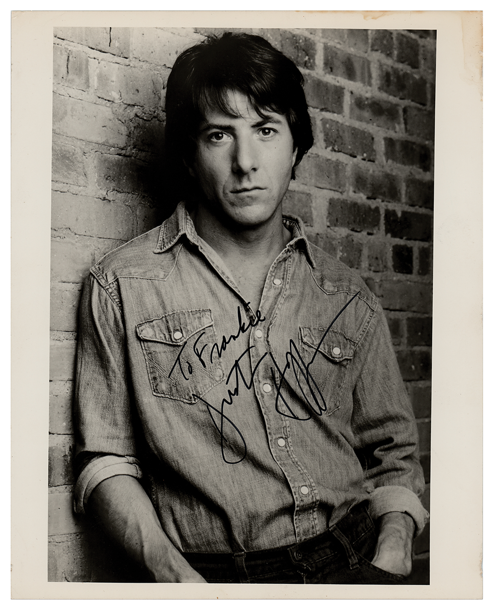 Early glossy 8 x 10 photo of Hoffman as a young actor, signed and inscribed in black felt tip, "To Frankie, Dustin Hoffman.” In fine condition, with small surface impressions to his hair and forehead.