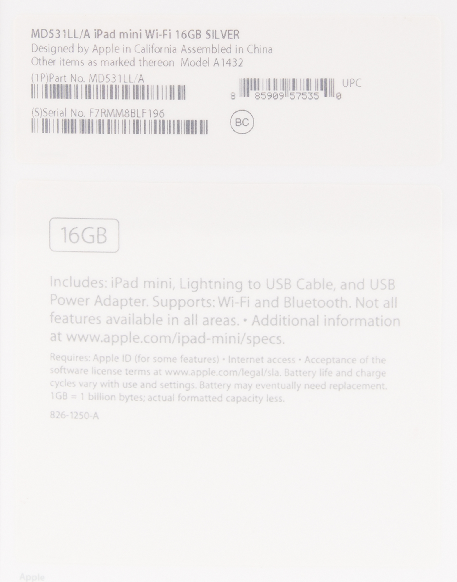 Unopened first generation silver Apple iPad Mini, Part No. MD531LL/A (16GB, Wi-Fi), Serial No. F7RMM88LF196. The front of the box features a side-profile image of the miniature tablet, and the back lists the device's specifications. In brand new, factory-sealed condition, with a retail label to the top edge.
