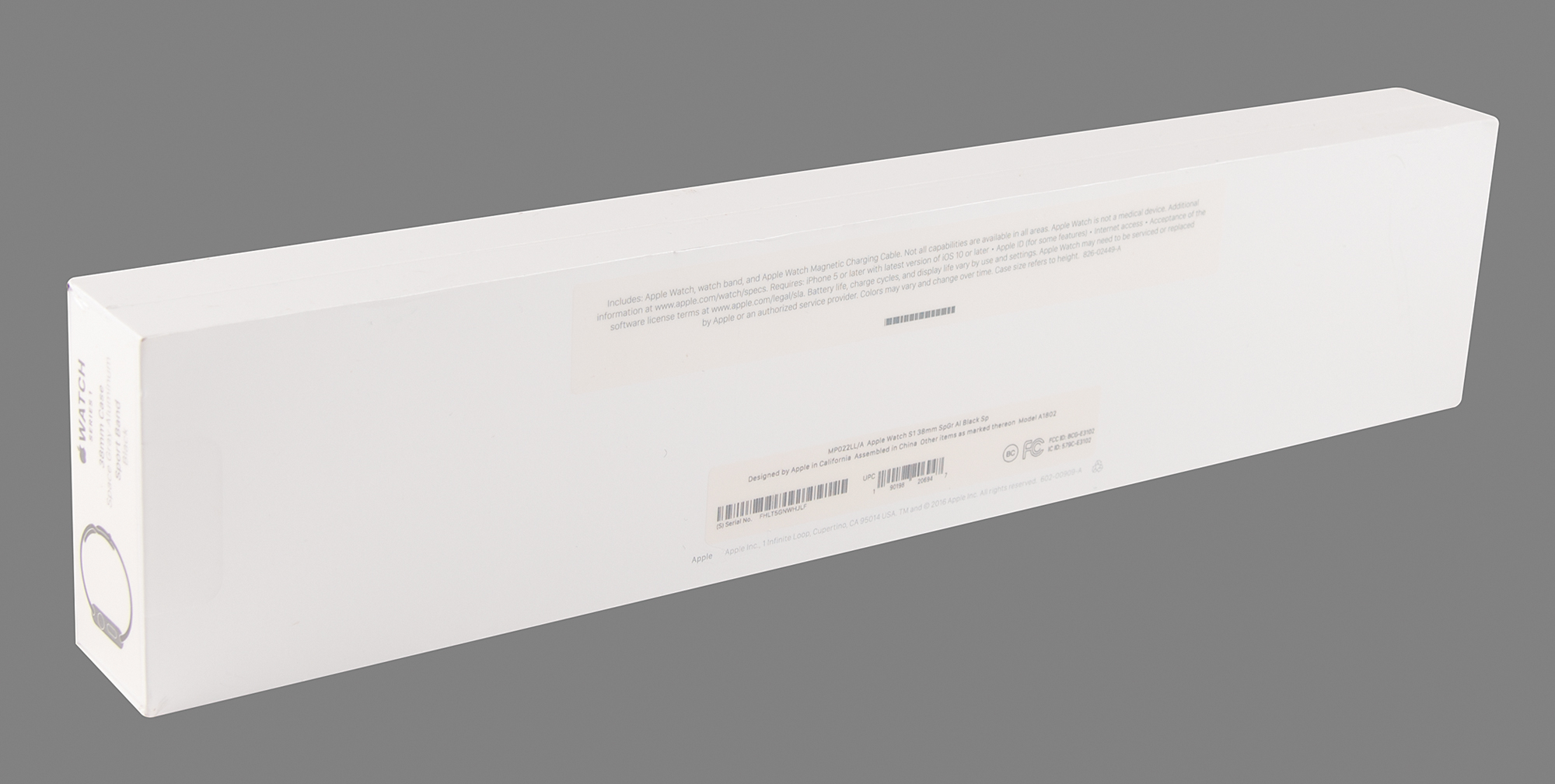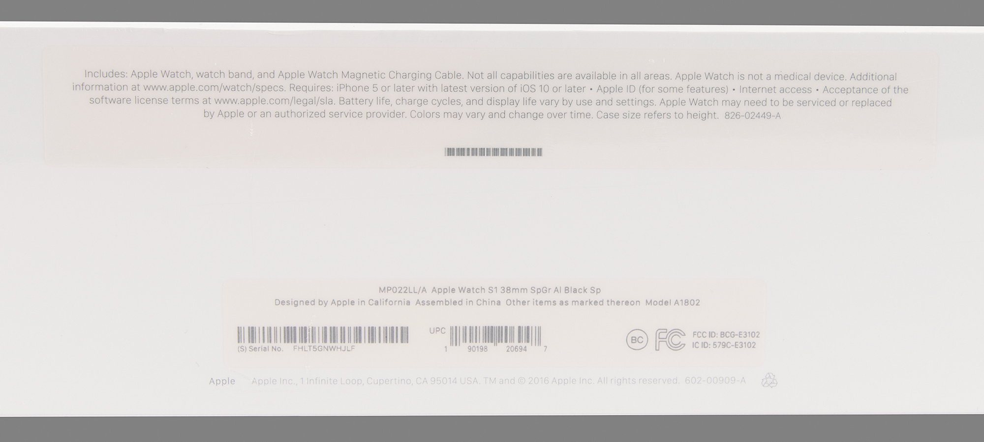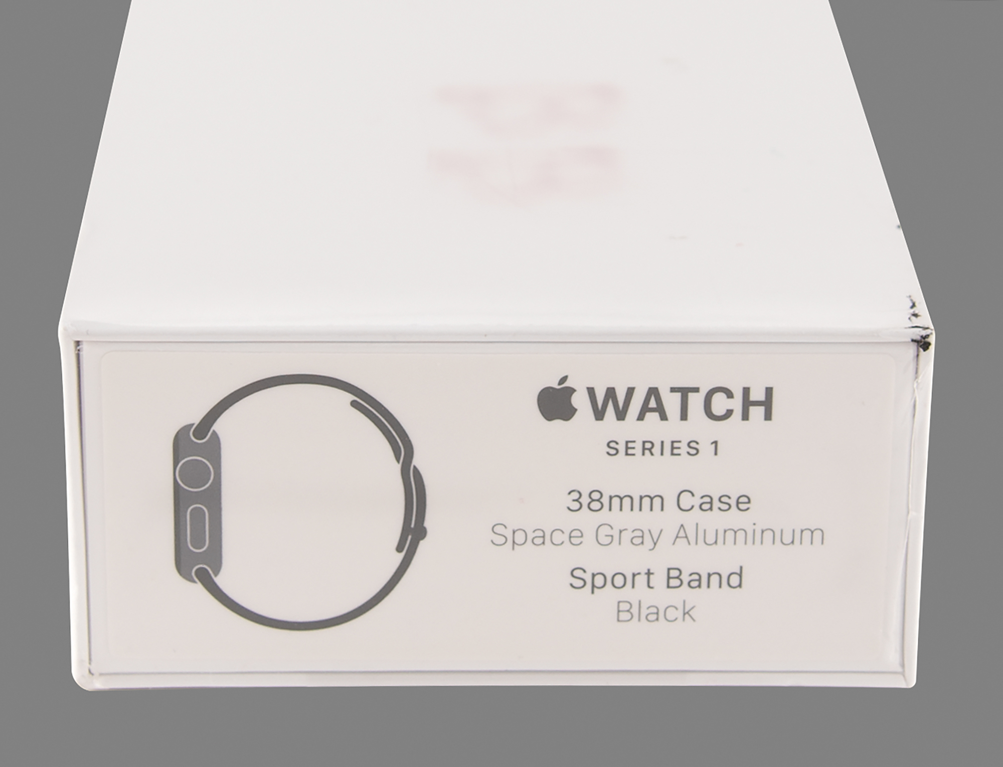 Unopened Apple Watch Series 1, Model No. MP022LL/A, Serial No. FHLT5GNWHJLF, featuring a 38mm space gray aluminum case and a black sport band. The Series 1 has a variant of the dual-core Apple S2 processor with GPS removed, known as the Apple S1P. In brand new, factory-sealed condition.