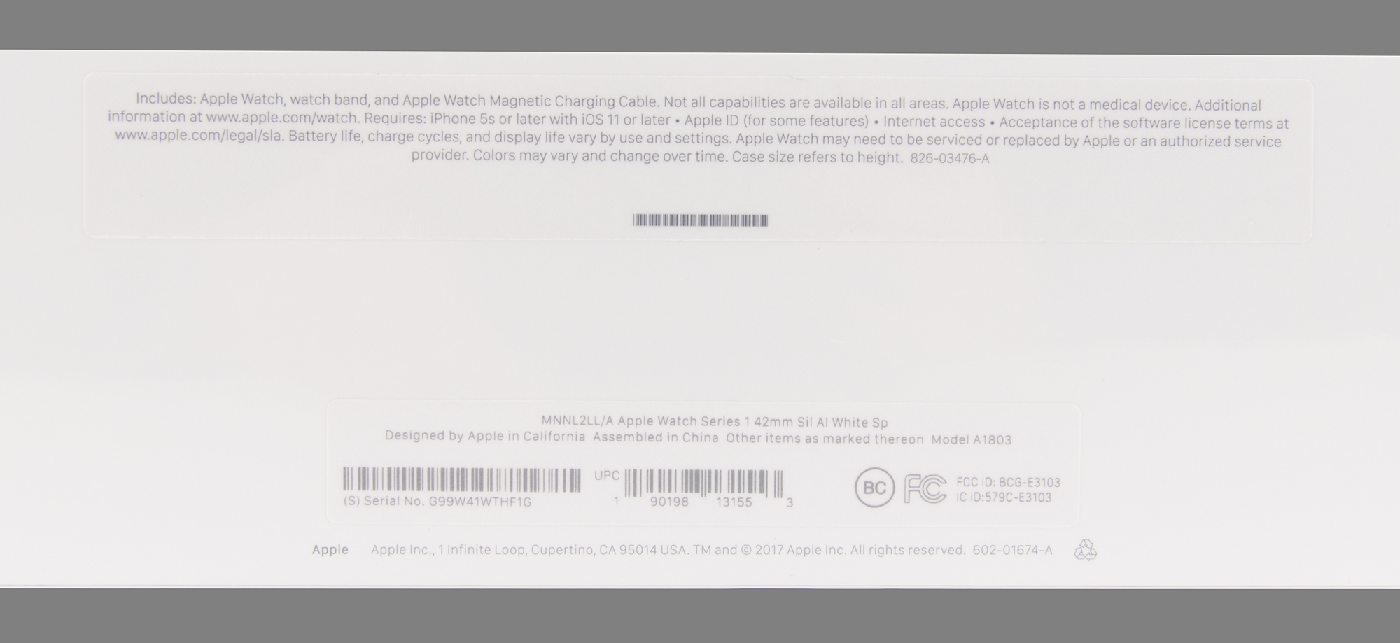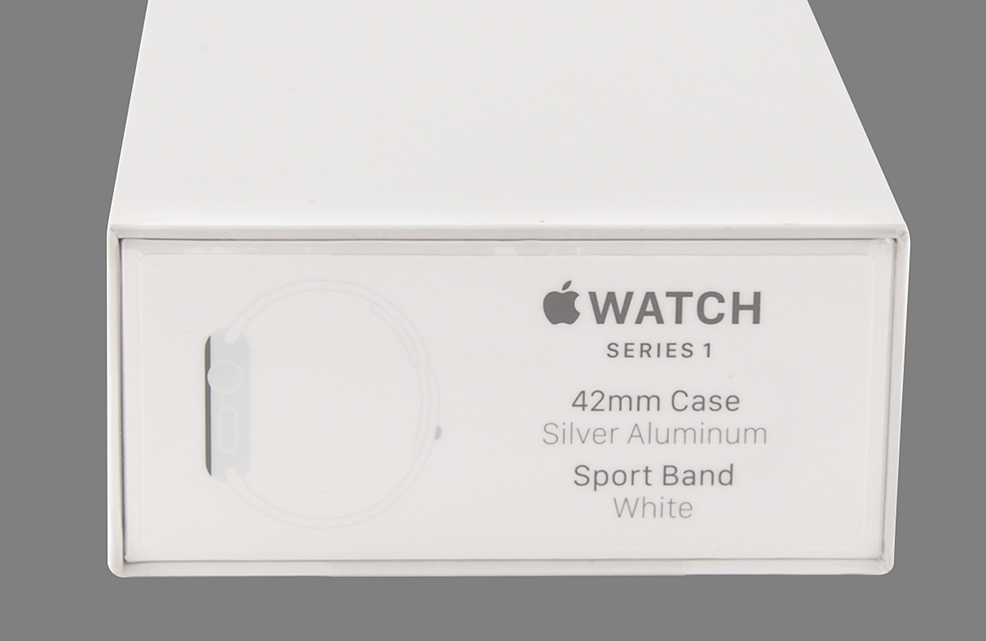 Unopened Apple Watch Series 1, Model No. MNNL2LL/A, Serial No. G99W41WTHF1G, featuring a 42mm silver aluminum case and a white sport band. The Series 1 has a variant of the dual-core Apple S2 processor with GPS removed, known as the Apple S1P. In brand new, factory-sealed condition.