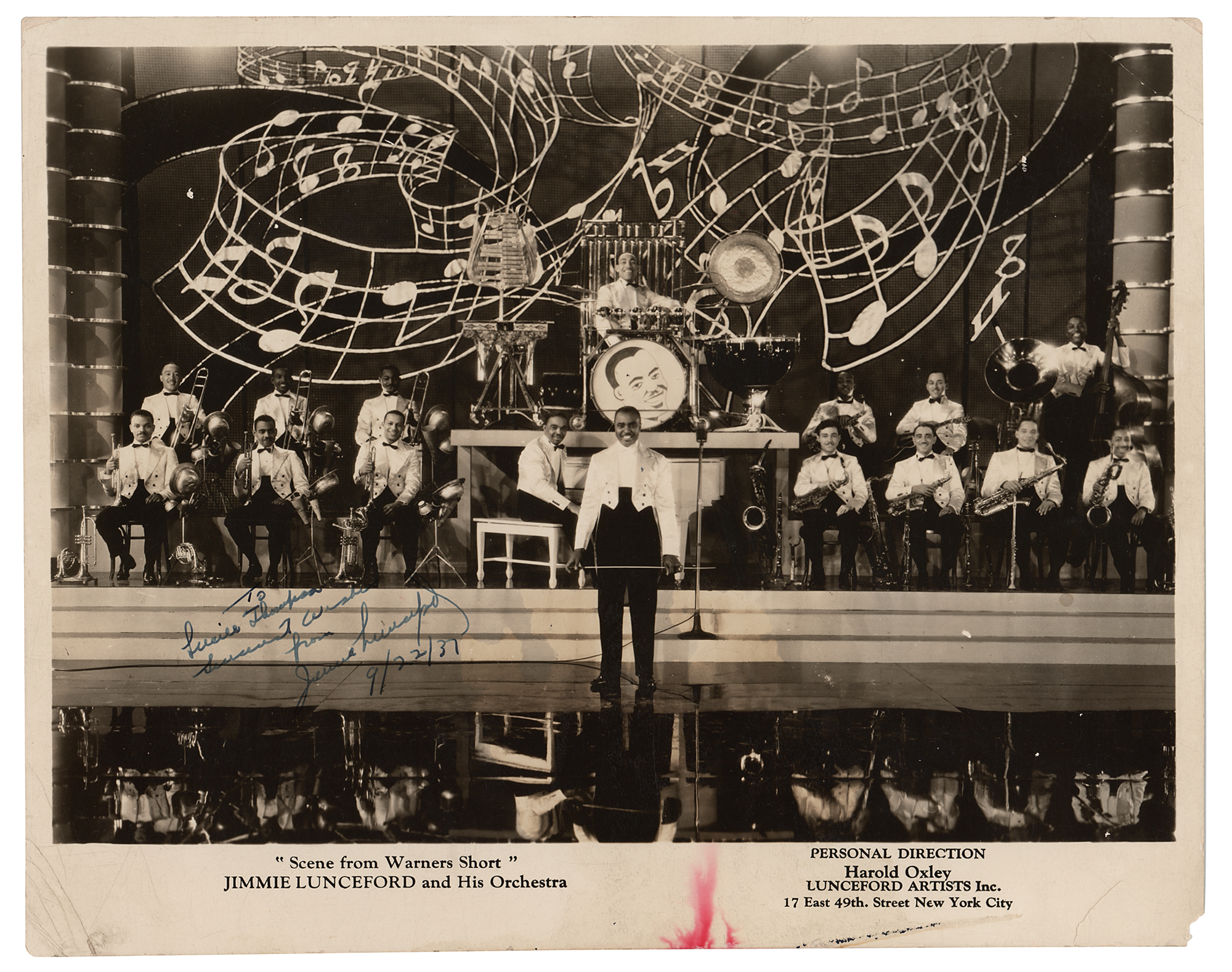 Vintage glossy 10 x 8 photo of Lunceford and his orchestra in a 'Scene from Warners Short,' signed and inscribed in fountain pen, "To Lucille Thompson, Sincerest Wishes from Jimmie Lunceford, 9/22/37.” In very good condition, with corner creasing, rough emulsion to the lower center, and a tear and stain to the bottom border.