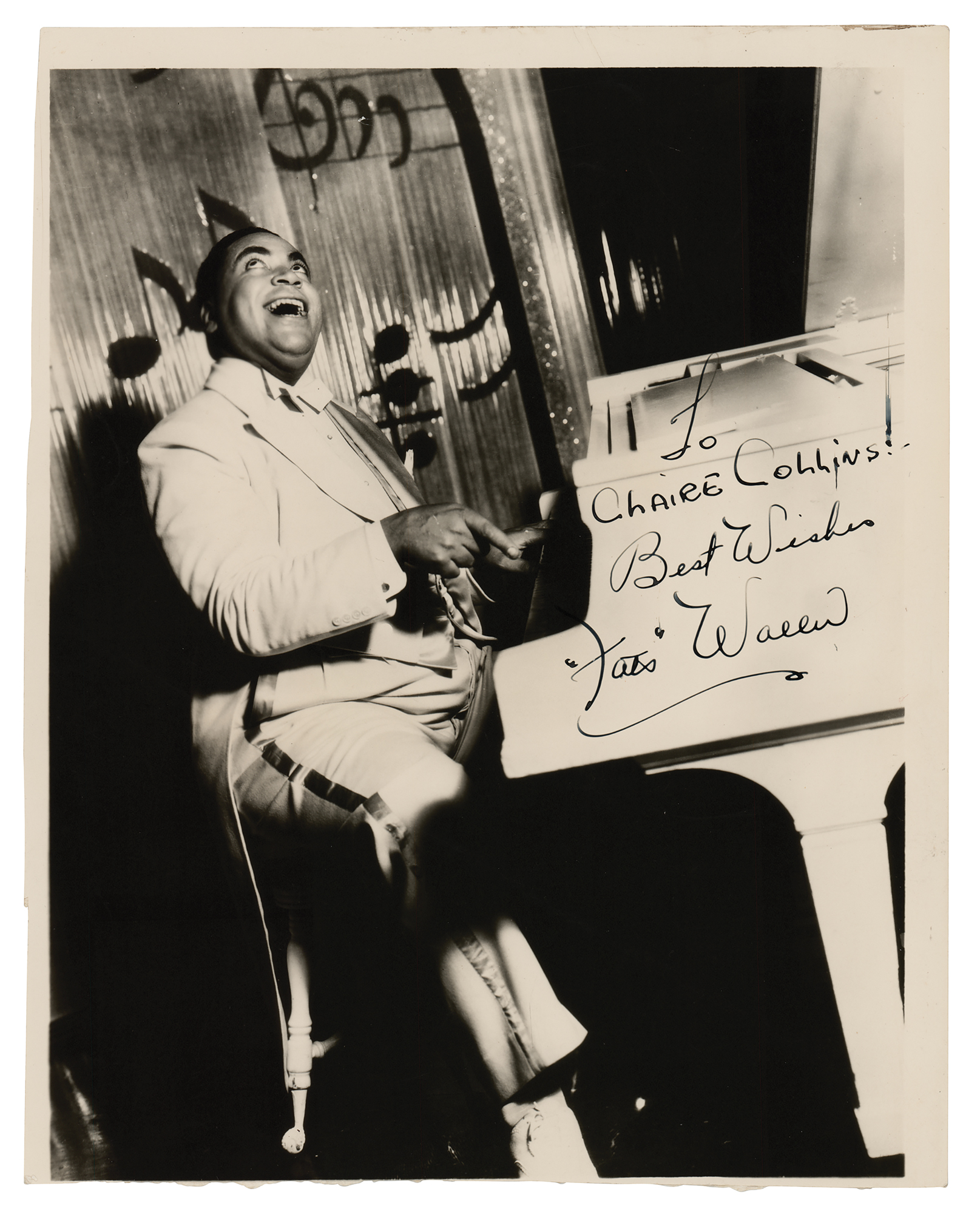 Jazz musician (1904–1943) known for his stride piano style and for standards such as 'Ain't Misbehavin'' and 'Honeysuckle Rose.' Vintage glossy 7.75 x 9.75 photo of Waller posing happily at his piano, signed and inscribed in fountain pen, "To Claire Collins, Best wishes, 'Fats' Waller.” In very good condition, with scattered creasing and irregularly trimmed borders.
