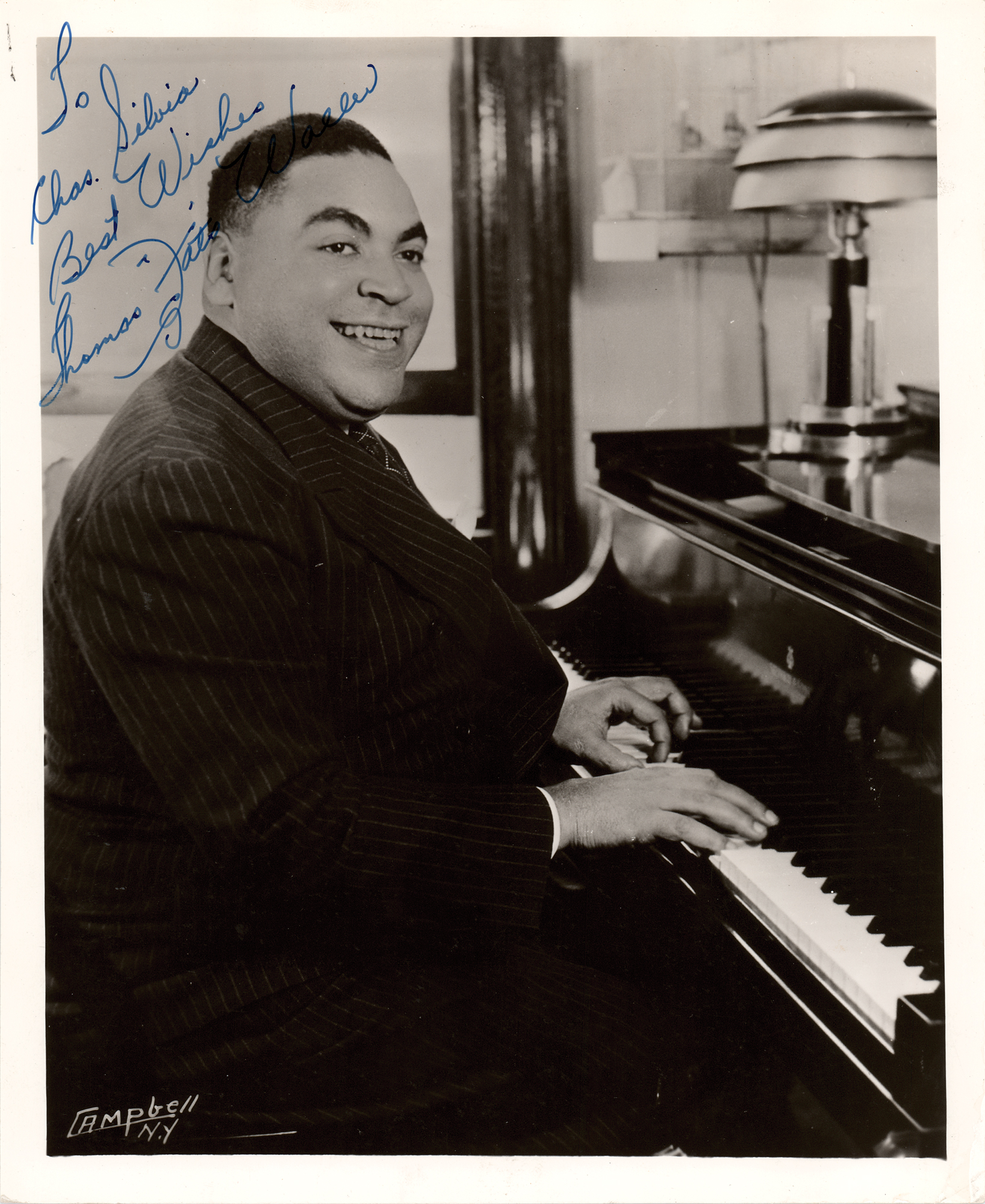 Jazz musician (1904–1943) known for his stride piano style and for standards such as 'Ain't Misbehavin'' and 'Honeysuckle Rose.' Great vintage glossy 8 x 10 photo of Waller smiling at his piano, signed and inscribed in fountain pen, "To Chas. Silvia, Best Wishes, Thomas 'Fats' Waller.” In fine condition.
