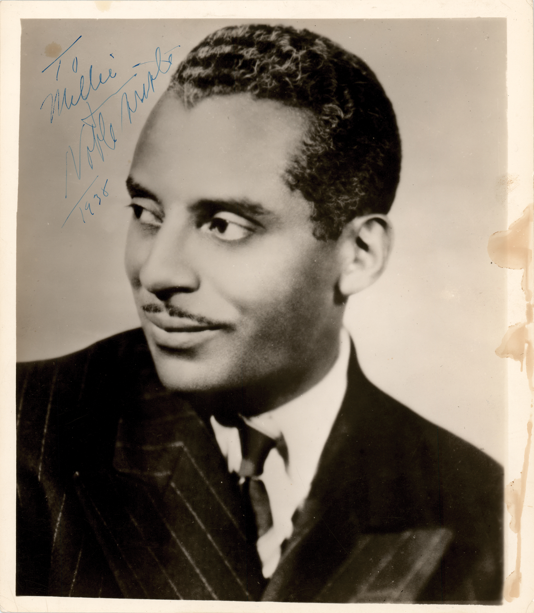 Jazz composer, bandleader, and playwright (1889-1975) best remembered for the Broadway musical Shuffle Along, and its hit song 'I'm Just Wild About Harry.' Uncommon vintage glossy 8 x 9.25 close-up photo of Sissle, signed and inscribed in blue fountain pen, "To Millie, Noble Sissle, 1938." Reverse bears a William Morris Agency stamp. In very good to fine condition, with trimmed edges, a small stain above the inscription, and staining to the right border which could be successfully matted out if desired. Previous owner notes that her mother, Emily Grous Hollister, nicknamed 'Millie,' obtained the signature while working as a concierge to the stars at Hartford, Connecticut's State Theatre during the late 1930s and early 1940s.
