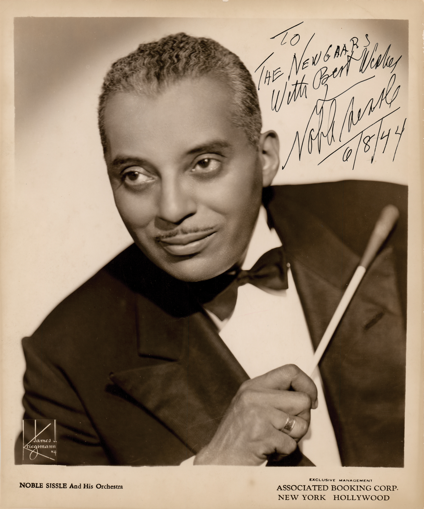 Jazz composer, bandleader, and playwright (1889-1975) best remembered for the Broadway musical Shuffle Along, and its hit song 'I'm Just Wild About Harry.' Vintage glossy 8 x 10 Associated Booking Corp. publicity photo of Sissle by James J. Kriegsmann of New York, signed and inscribed in black ink, "To the Newgaars, with best wishes, Noble Sissle, 6/8/44." In fine condition, with scattered small creases.