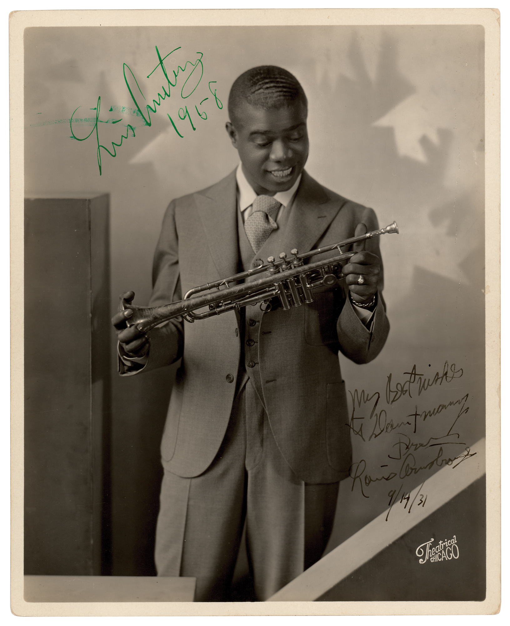 Exceptional vintage pearl-finish 8 x 10 double-weight photo by Theatrical of Chicago, showing Armstrong admiring his trumpet in a three-quarter-length pose, signed and inscribed in fountain pen, "My best wishes to Dan & Mary, from, Louis Armstrong, 9/14/31,” and then signed again twenty-seven years later in bold green ink, "Louis Armstrong, 1958." In very good to fine condition, with a brush to the green ink, some streaked irregularity to the emulsion, and light silvering to darker areas of the image.