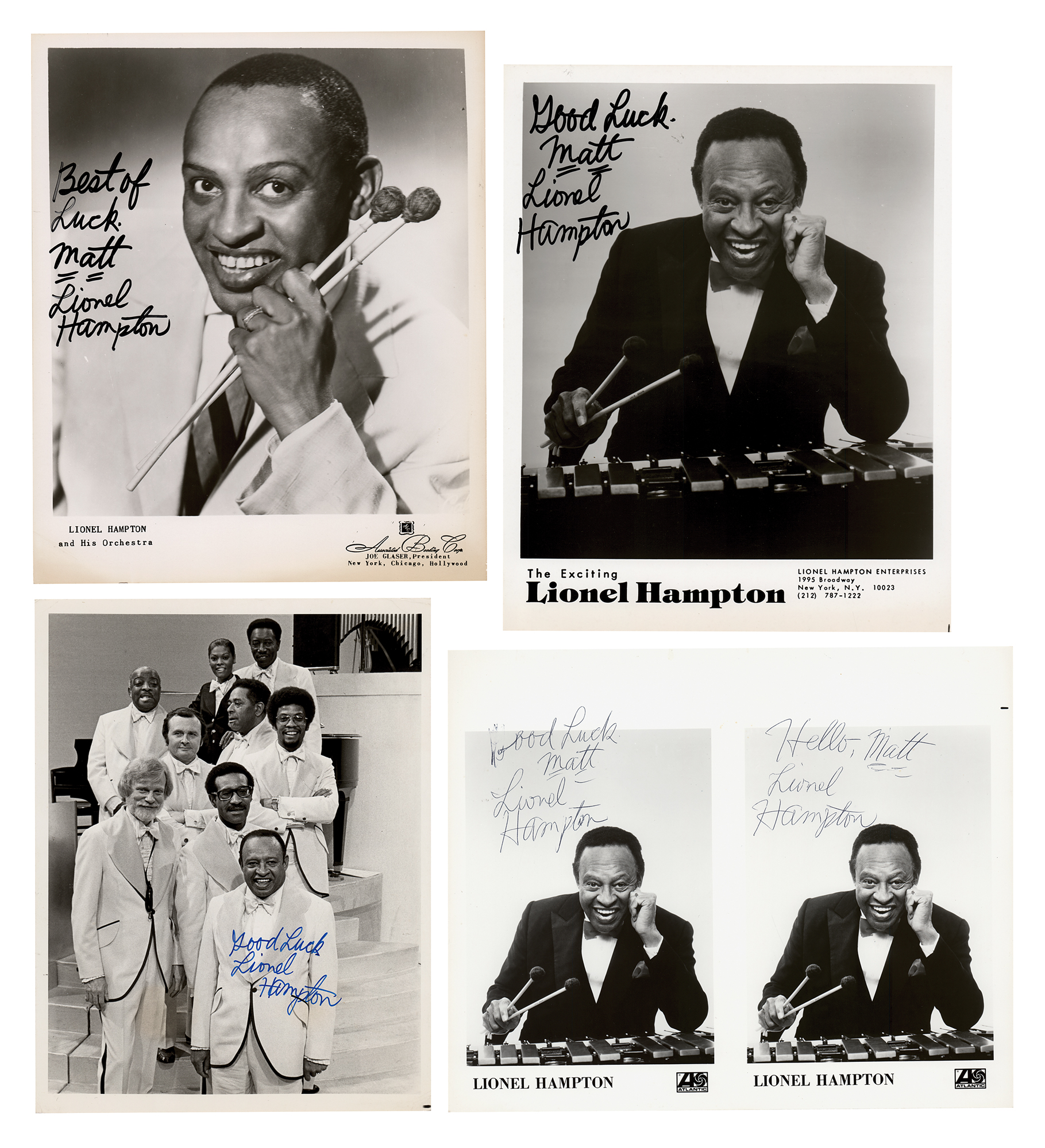 Four glossy photos of Lionel Hampton, ranging in size from 7 x 9 to 8 x 10, each signed in ink by the great bandleader, with three inscribed to "Matt." One of the photos features two identical Atlantic Records publicity portraits side by side, each of which is signed. In overall fine condition.