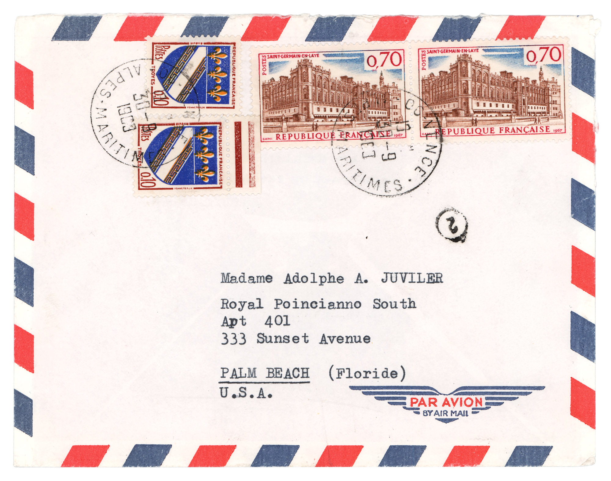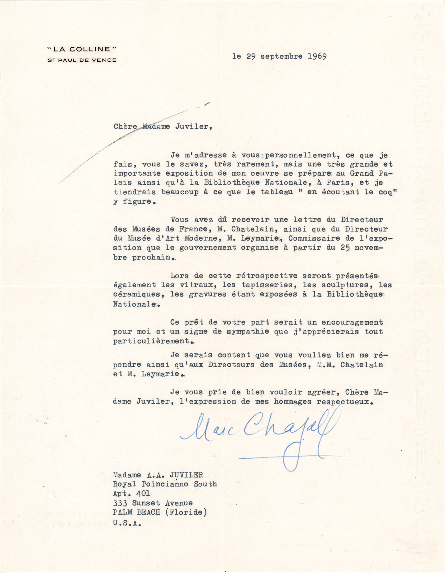 TLS in French, one page, 8.25 x 10.5, La Colline letterhead, September 29, 1969. Letter to Madame A. A. Juviler, in part (translated): "I address myself to you personally, which I do, you know, very rarely, but a large and important exhibition of my work is getting underway at the Grand Palais as well as at the Bibliothèque Nationale, in Paris, and it would mean a lot that the picture 'en écountant le coq' could appear in it. You must have received a letter from the Director of the Museums of France, M. Chatelain, as well as from the Director of the Museum of Modern Art, M. Leymarie, Superintendent of the exhibition that the government is organizing after November 25th. During this retrospective, stained glass windows, tapestries, sculptures, ceramics, engravings will all be equally presented at the Bibliothèque Nationale. The loan on your part would be encouraging for me, and a sign of sympathy that I would particularly appreciate. I would be happy that you would want to respond to me as well as to the Directors of the Museums, M.M. Chatelain and M. Leymarie." In fine condition. Accompanied by the original mailing envelope.