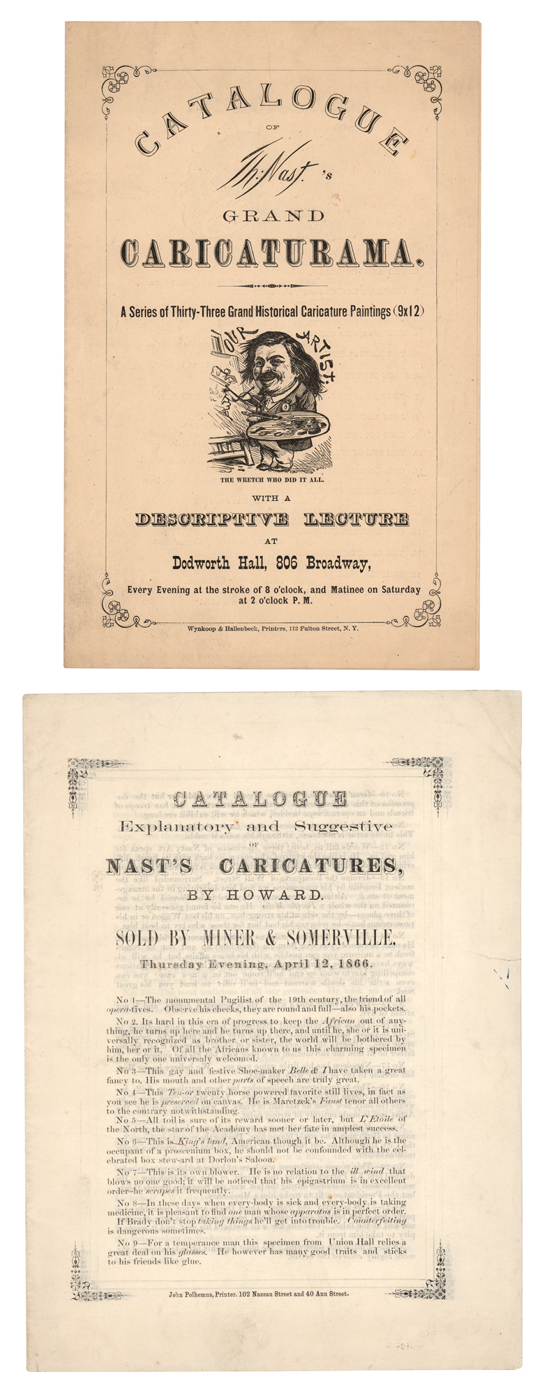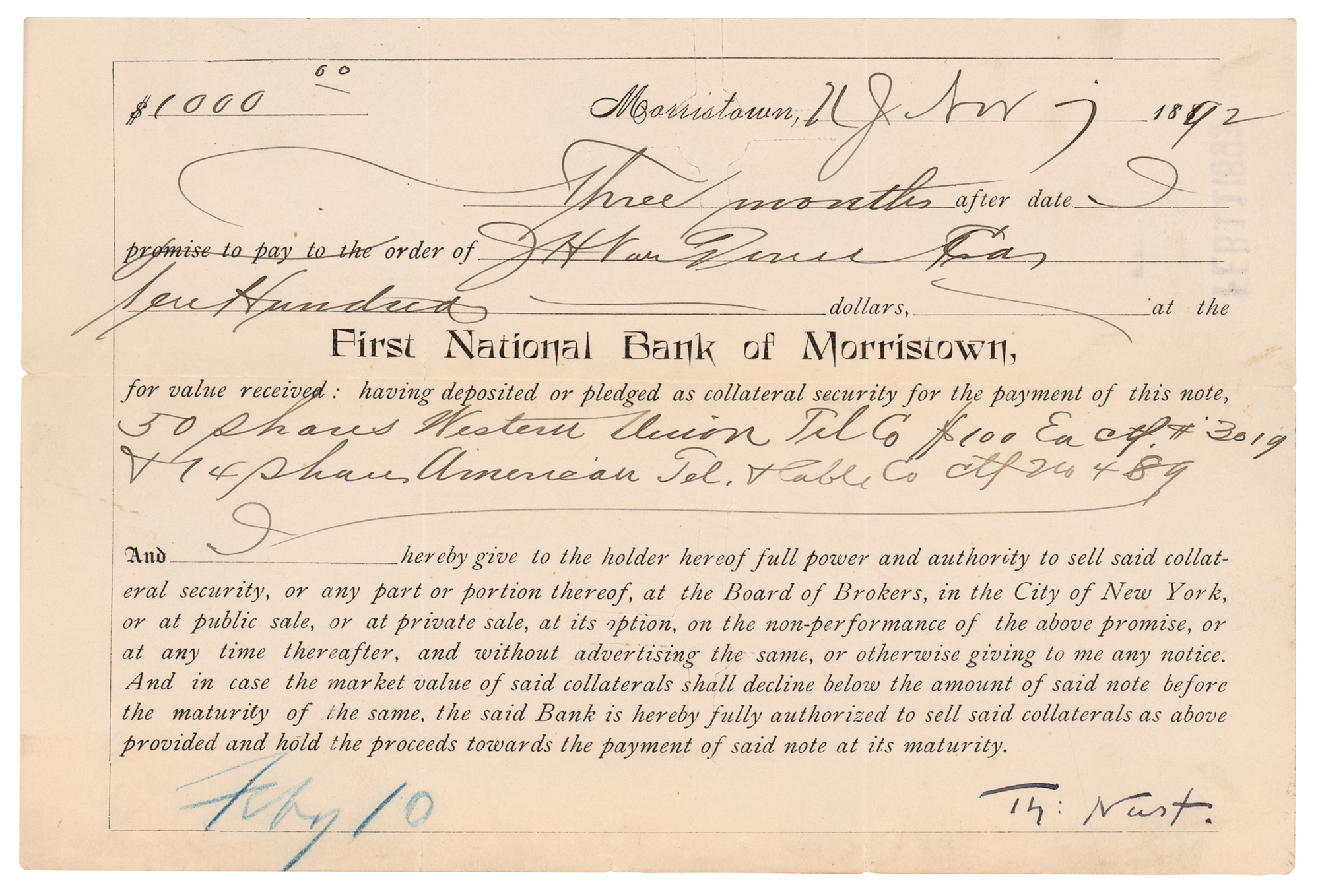 Influential early American political cartoonist and illustrator (1840–1902) considered to be the 'Father of the American Cartoon.' Partly-printed DS, signed “Th: Nast,” one page, 8 x 5.5, November 11, 1892. Promissory note, in part: "Three months after date I promise to pay…ten hundred dollars, at the First National Bank of Morristown, for value received." Neatly signed at the conclusion in ink by Nast. In fine condition. Accompanied by two unsigned brochures containing descriptions of Nast's caricatures.