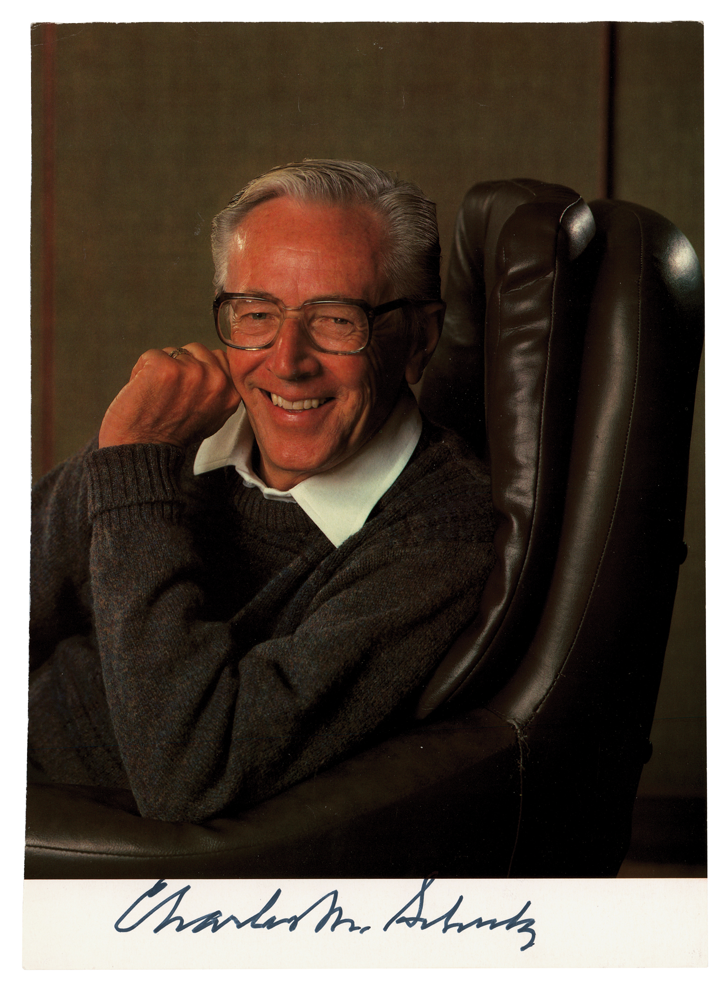 Color 8 x 11.25 book photo of the legendary Peanuts cartoonist, signed in the lower border in black felt tip, "Charles M. Schulz." In fine condition, with some light creasing in the top background area.