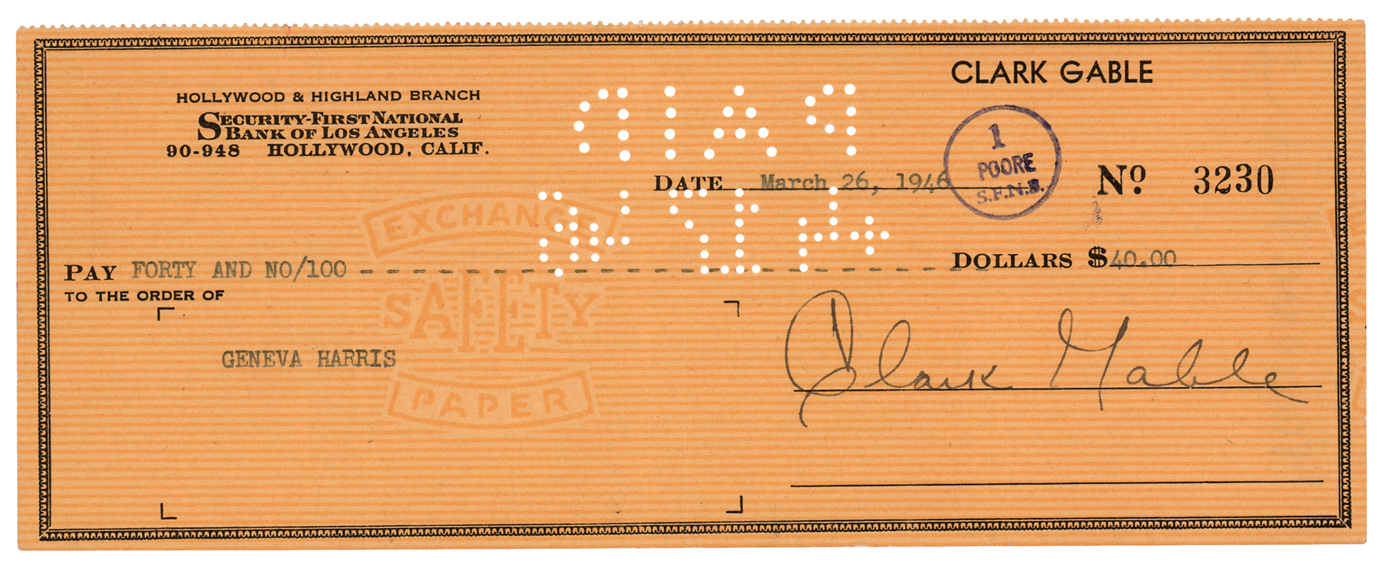 Personal check, 8.25 x 3.25, filled out in type and signed by Gable, "Clark Gable," payable to Geneva Harris for $40, March 26, 1946. In fine condition.