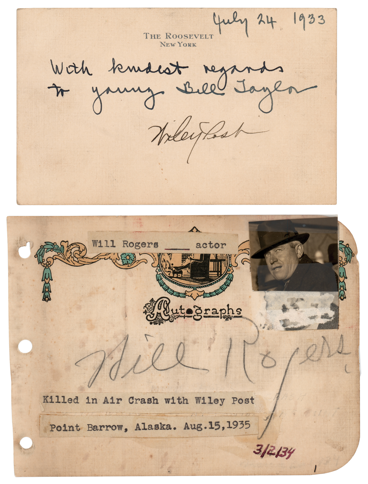 Two signatures: a vintage pencil signature, "Will Rogers," on an off-white 5.75 x 4.25 album page, with a typed caption affixed below: "Killed in Air Crash with Wiley Post, Point Barrow, Alaska. Aug. 15, 1935"; and a vintage fountain pen signature, "Wiley Post," on an off-white 5.25 x 3.25 stationery card from The Roosevelt in New York, with the date and an inscription added in another hand: "July 24, 1933, With kindest regards to young Bill Taylor." In very good to fine condition, with staining and soiling to the Rogers page.