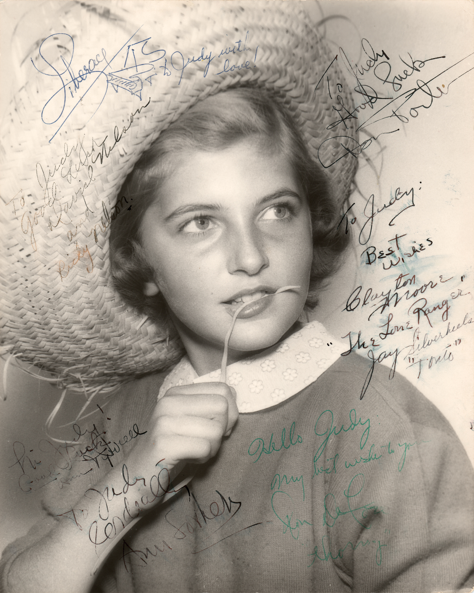 Vintage matte-finish 8 x 10 photo of a young lady in a straw hat, signed and inscribed in various inks to "Judy" by nine notable entertainers, including: Liberace, Ricky Nelson, David Nelson, Ann Sothern, Clayton Moore (adding "The Lone Ranger"), Jay Silverheels (adding "Tonto"), Don Porter, Don DeFore, and Ann Tyrrell. In very good to fine condition, with light brushing and fading to some of the signatures.