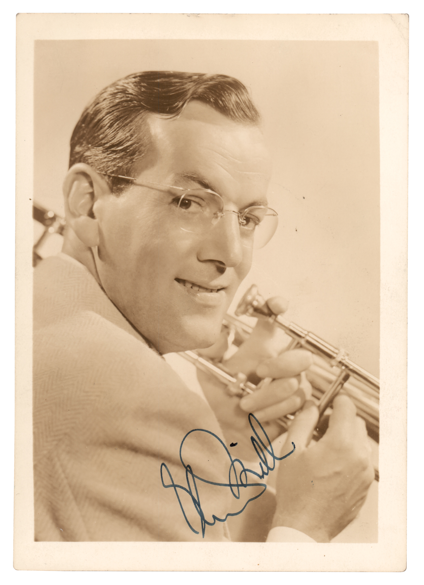 Popular big band trombonist and bandleader (1904-1944) who was lost in action over the English Channel during World War II. Vintage matte-finish 5 x 7 photo of Miller with his trombone over his shoulder, signed in fountain pen, "Glenn Miller.” In very fine condition.