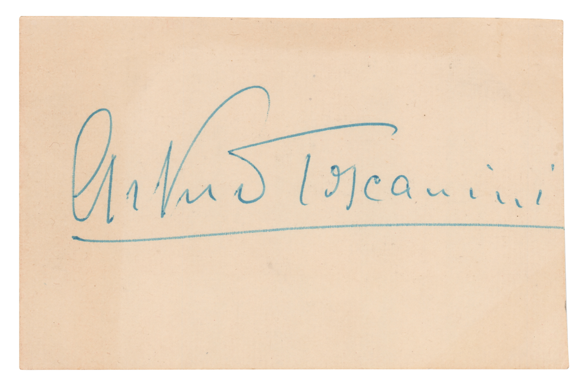 Vintage ballpoint signature of the great conductor, "Arturo Toscanini,” on an off-white 4.5 x 3 slip. In fine condition.