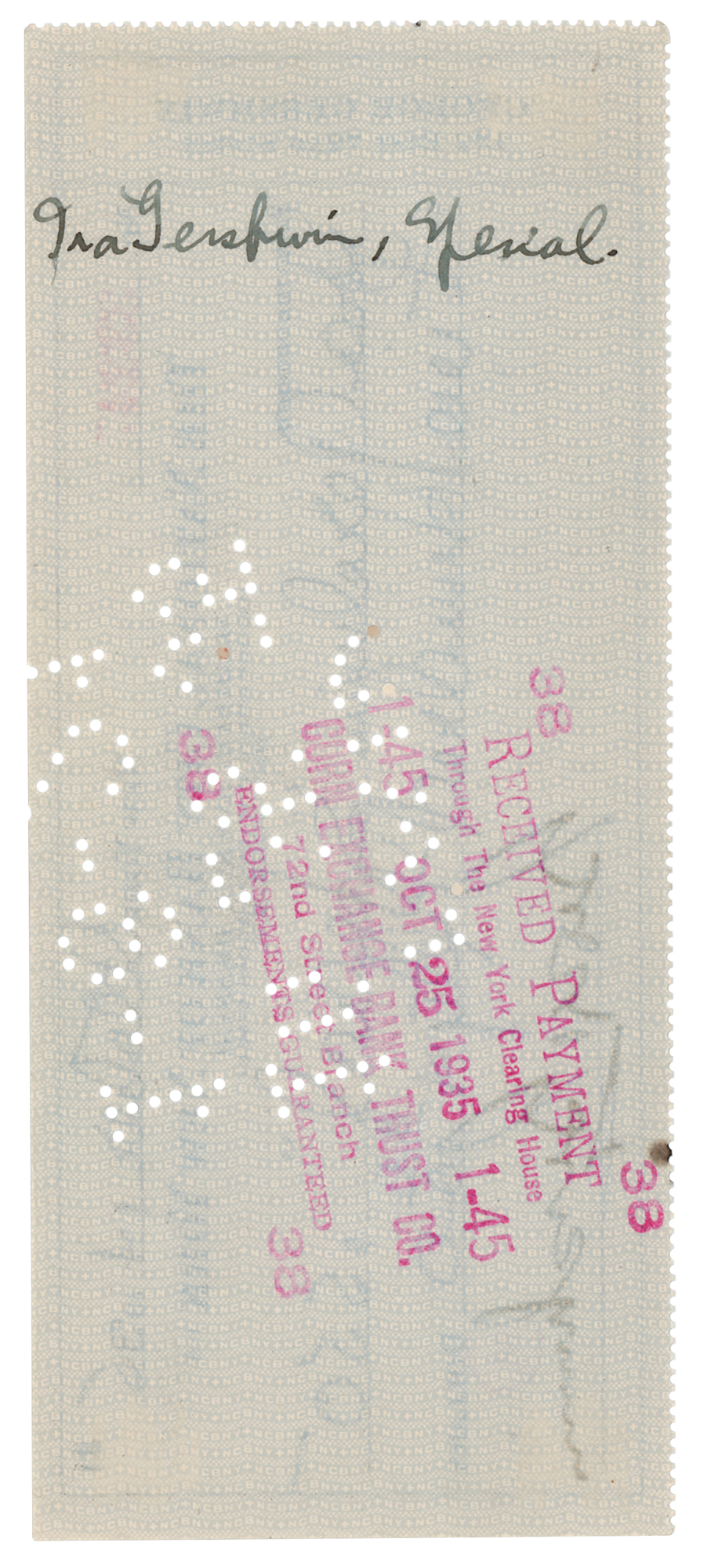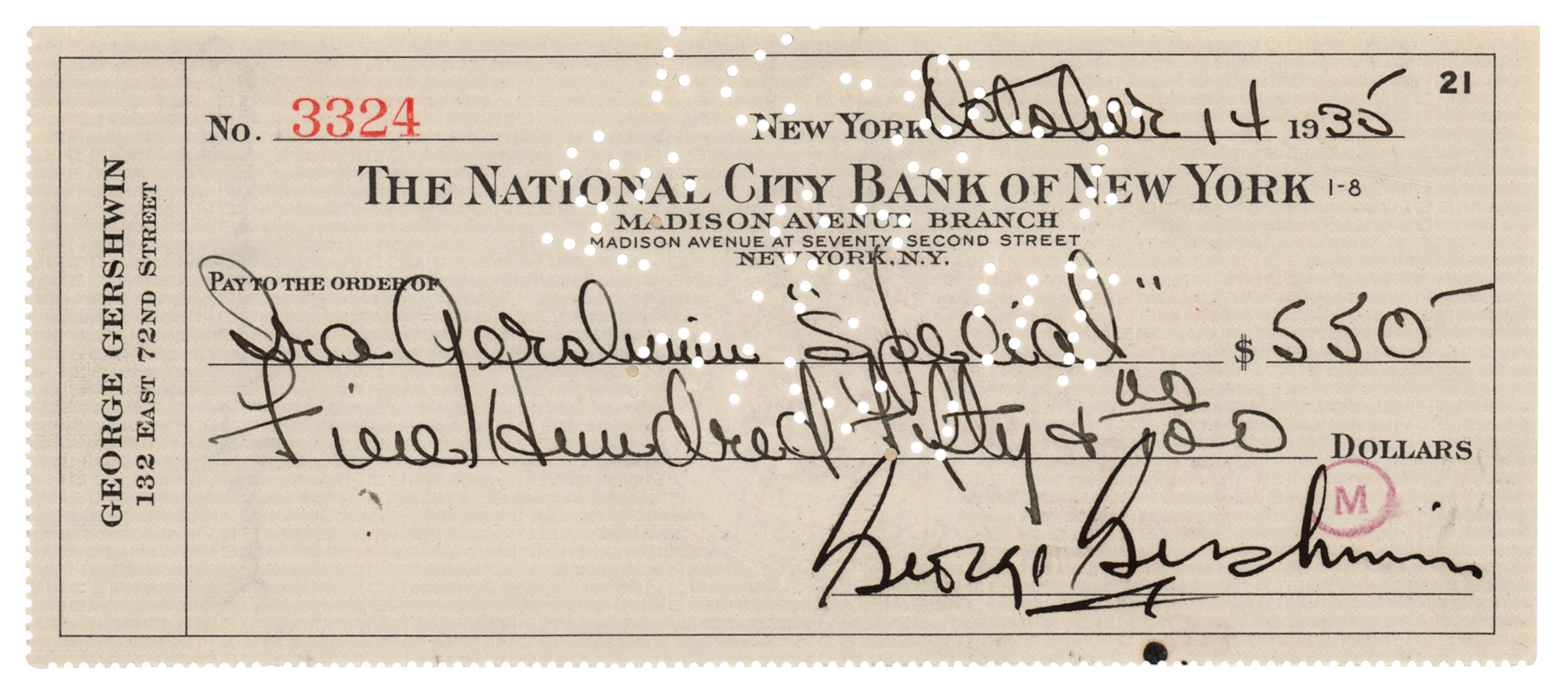 George Gershwin personal check, 6.5 x 2.75, filled out in another hand and signed by George Gershwin, "George Gershwin," payable to Ira Gershwin Special for $550.00, October 14, 1935, and endorsed on the reverse, "Ira Gershwin, Special." In fine condition.