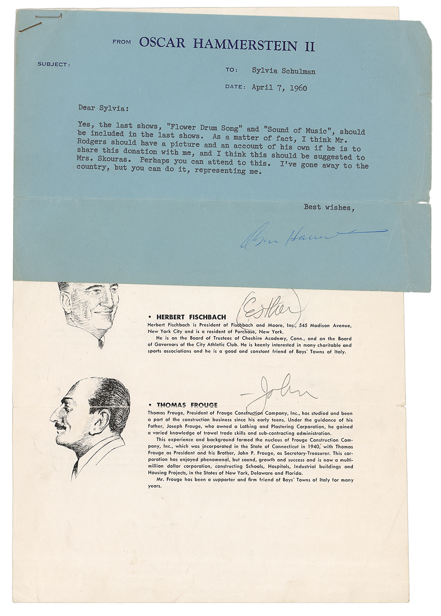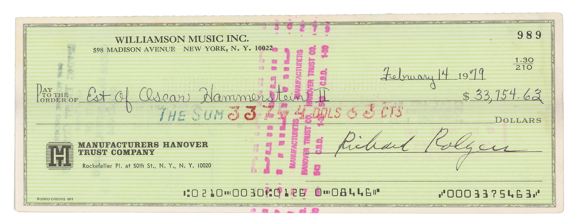 Two items: a TLS signed "Oscar Hammerstein," one page, 8.25 x 5.25, personal letterhead, April 7, 1960, to Sylvia Schulman, concerning a brief biography to be published as part of a philanthropic program, in part: "Yes, the last shows, 'Flower Drum Song' and 'Sound of Music,' should be included in the last shows. As a matter of fact, I think Mr. Rodgers should have a picture and an account of his own if he is to share this donation with me…Perhaps you can attend to this"; and a Williamson Music Inc. check, 8.25 x 3, filled out in another hand and signed by Rodgers, "Richard Rodgers," payable to "Est. of Oscar Hammerstein II" for $33,754.63, February 14, 1979. In very good to fine condition, with splitting to the ends of the horizontal fold of the Hammerstein letter.