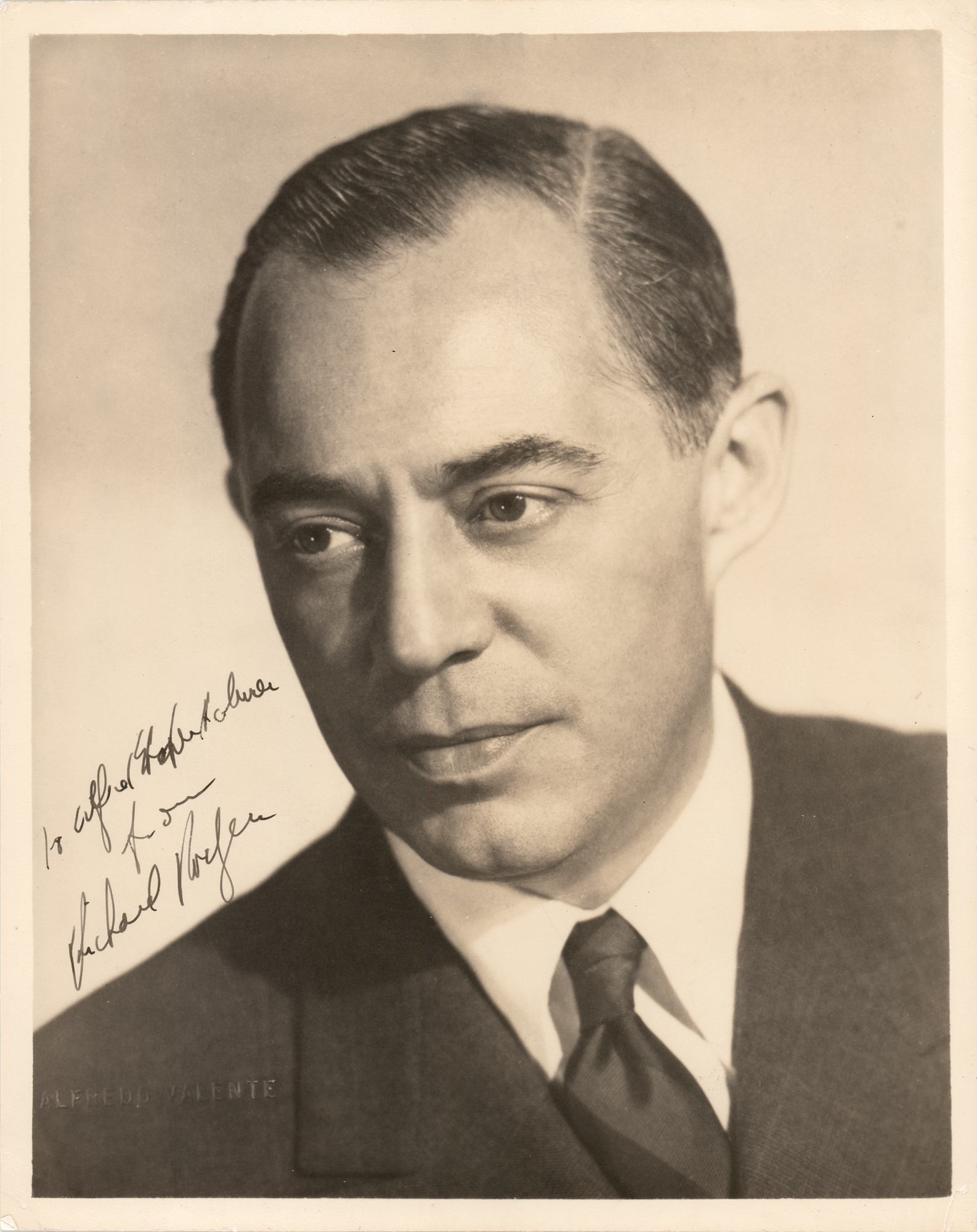 Vintage matte-finish 8 x 10 photo of Rodgers in a handsome close-up pose by Alfredo Valente, signed and inscribed in fountain pen, "To Alfred Stephen…from Richard Rodgers.” In fine condition, with small creases to the corner tips.
