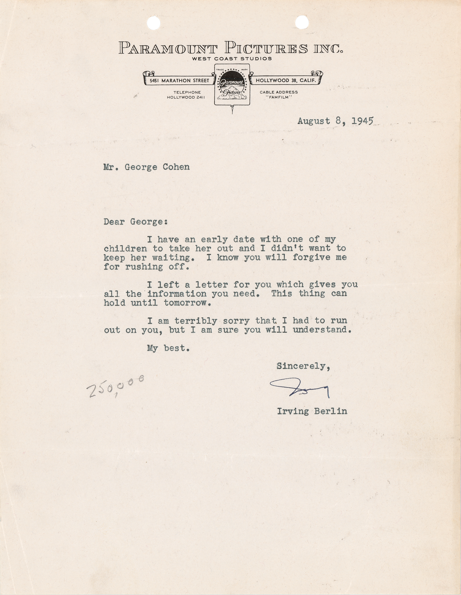 TLS signed "Irving," one page, 8.5 x 11, Paramount Pictures letterhead, August 8, 1945. Letter to George Cohen, in part: "I have an early date with one of my children to take her out and I didn't want to keep her waiting. I know you will forgive me for rushing off." In fine condition.
