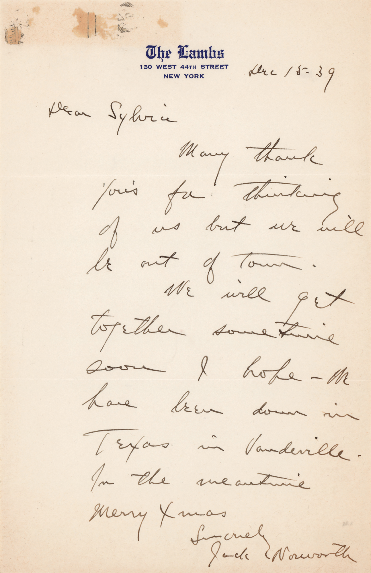 American performer and songwriter (1879–1959) best known for co-writing such standards as the baseball anthem, ‘Take Me Out to the Ball Game,’ and ‘Shine On, Harvest Moon.’ ALS, one page, 5.5 x 8.5, The Lambs letterhead, December 15, 1939. Handwritten letter to "Sylvia," in part: "Many thank you's for thinking of us but we will be out of town. We will get together sometime soon I hope—we have been down in Texas…In the meantime Merry Xmas." In fine condition, with some old clipping residue at the top edge.