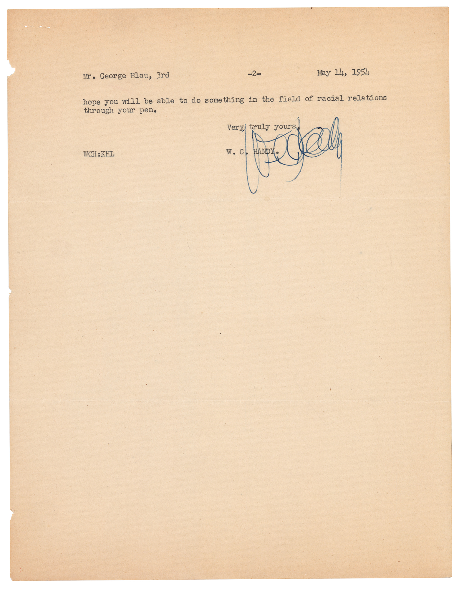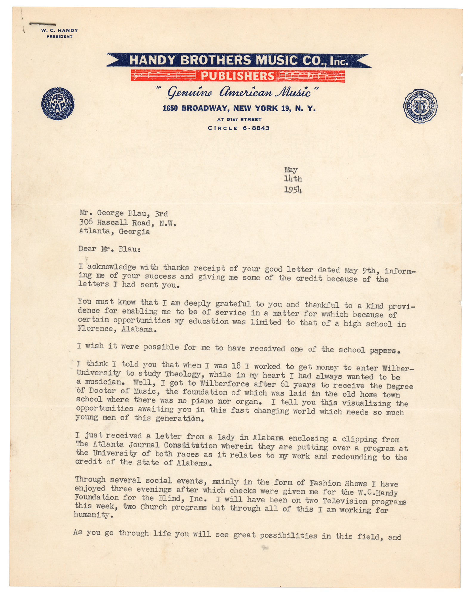TLS, two pages, 8.5 x 11, Handy Brothers Music Co., Inc. letterhead, May 14, 1954. Letter to George Blau in Atlanta, in part: "You must know that I am deeply grateful to you and thankful to a kind providence for enabling me to be of service in a matter for which because of certain opportunities my education was limited to that of a high school in Florence, Alabama. I wish it were possible for me to have received one of the school papers.