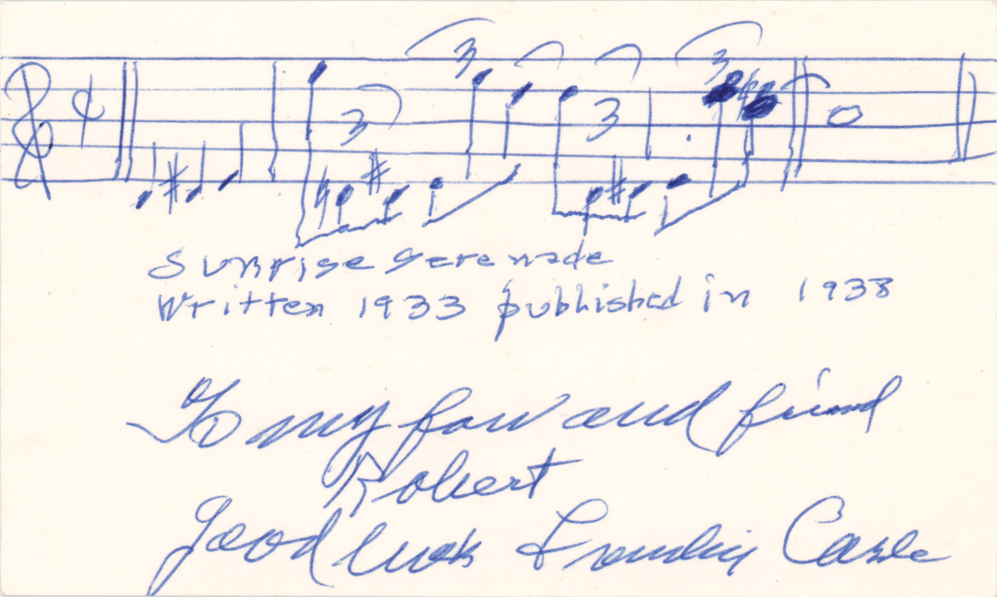 Pianist and bandleader (1903–2001) nicknamed 'The Wizard of the Keyboard.' AMQS on an off-white 5 x 3 card. Carle pens a few bars of music, identified below as "Sunrise Serenade, written 1933 published in 1938," and signed and inscribed in ballpoint, "To my fan and friend Robert, Good luck, Frankie Carle." In very fine condition.