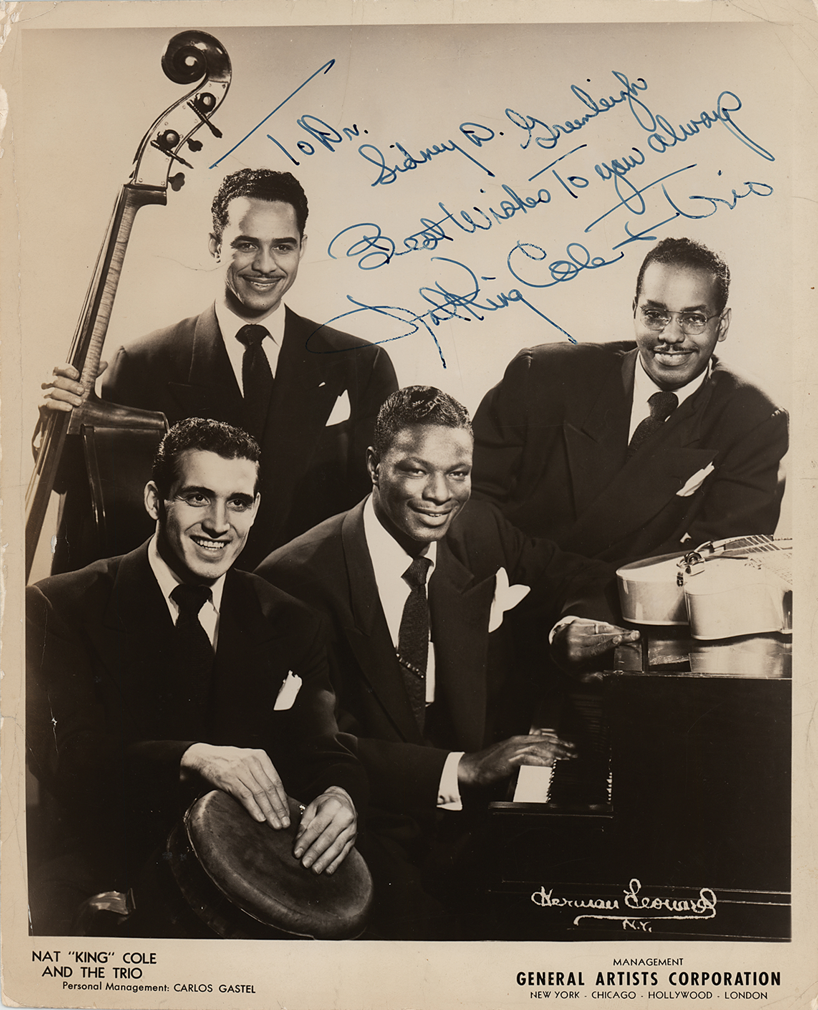 Vintage glossy 8 x 10 publicity photo of Cole and his trio by the Herman Leonard Studio of New York, signed and inscribed in fountain pen, "To Dr. Sidney D. Greenleigh, Best wishes to you always, Nat King Cole + Trio.” In very good condition, with overall creasing.