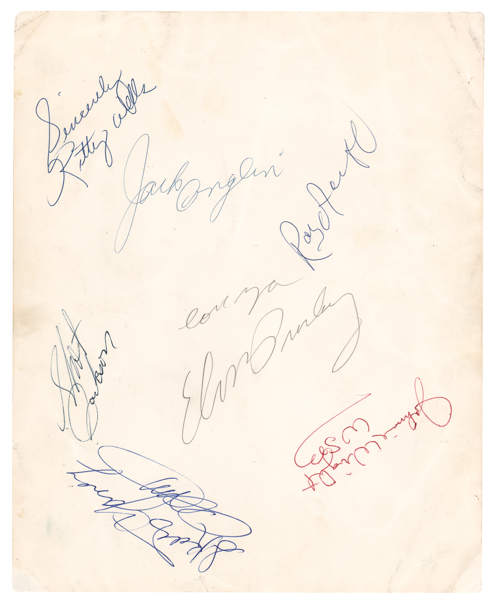 Vintage glossy 8 x 10 publicity photo of Elvis from his Sun Records days, signed on the reverse in pencil, "Love ya, Elvis Presley." Additionally signed in various inks by six other musicians: Roy Acuff, Kitty Wells, Johnnie Wright, Jack Anglin, Shot Jackson, and Skeets Yaney. In very good condition, with overall creasing, a short tear to the top edge, and surface impressions to the image side from the signatures on the reverse; the signed side is otherwise clean and bright, with superb, very clear signatures.