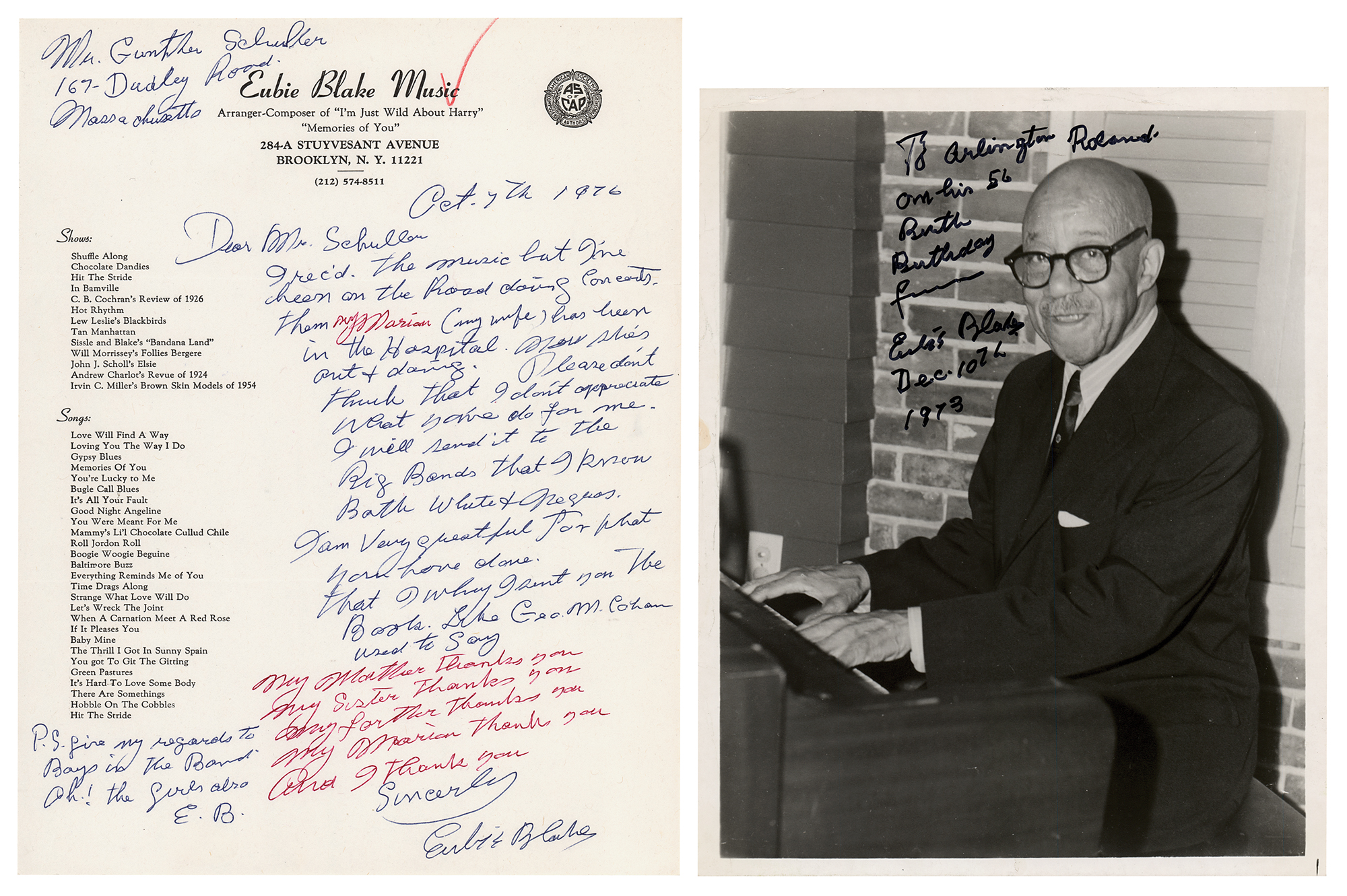 Two items: a glossy 8 x 10 photo of Blake at the keyboard, signed and inscribed in black felt tip, "To Arlington Roland…Eubie Blake, Dec. 10th 1973"; and an ALS, one page, 8.5 x 11, Eubie Blake Music letterhead, October 7, 1976, to composer Gunther Schuller. In part: "I rec'd the music but I've been on the road doing concerts…Please don't think I don't appreciate what you've done for me. I will send it to the Big bands that I know, both white & Negroes…Like Geo. M. Cohen used to say My mother thanks you. My father thanks you. My sister thanks you. And I thank you." In overall fine condition.