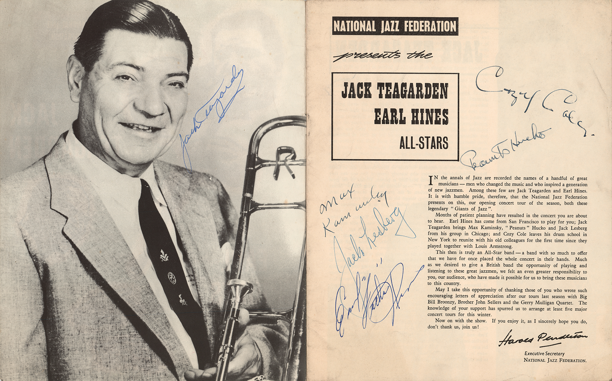 Vintage circa 1957 souvenir program for the National Jazz Federation's presentation of the Jack Teagarden/Earl Hines All-Stars, 20 pages, 8.25 x 10.25, signed inside in blue ink by Jack Teagarden, Earl 'Fatha' Hines, Max Kaminsky, 'Peanuts' Hucko, Jack Lesberg, and Cozy Cole. In fine condition, with light handling wear.